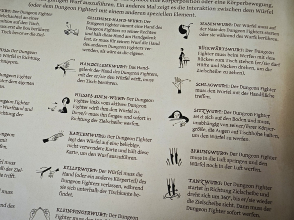 Nun geht es ans Eingemachte: Werft den Würfel auf die Zielscheibe, von einer beliebigen Position, aus einer beliebigen Distanz. Aber halt! Das ist nicht so trivial wie es sich anhört. Es gibt einige Regeln zu beachten. Wichtigste Grundregel: der Würfel muss mindestens einmal außerhalb der Zielscheibe aufkommen, bevor er die Zielscheibe berührt und (idealerweise) auf der Zielscheibe liegen bleibt. Es können gleichzeitig bis zu drei weitere Wurfanforderungen gelten. Die meisten Monster kommen mit Wurfanforderungen, einige Räume auf den Verlieskarten und jede Waffe, mit der sich Helden ausrüsten können, haben ebenfalls eine Anforderung. Mal muss man blind werfen, mal im Sprung, mal unter der Tischkante oder unters Bein hinweg. Insgesamt gibt es 26 verschiedene Wurfvoraussetzungen. Alle aktiven Anforderungen müssen kombiniert werden, um erfolgreich anzugreifen und den geworfenen Schaden auch zufügen zu dürfen. Das Verwenden einer Waffe im Übrigen ist immer optional. Erfüllt man die Wurfanforderung der Waffe, richtet man +2 Schaden an. Wurfanforderungen von Monstern und Verlieskarten müssen erfüllt werden. Würfel bleiben nach dem Wurf immer liegen, wo sie sind, und können bei späteren Würfen ein zusätzliches Hindernis darstellen.