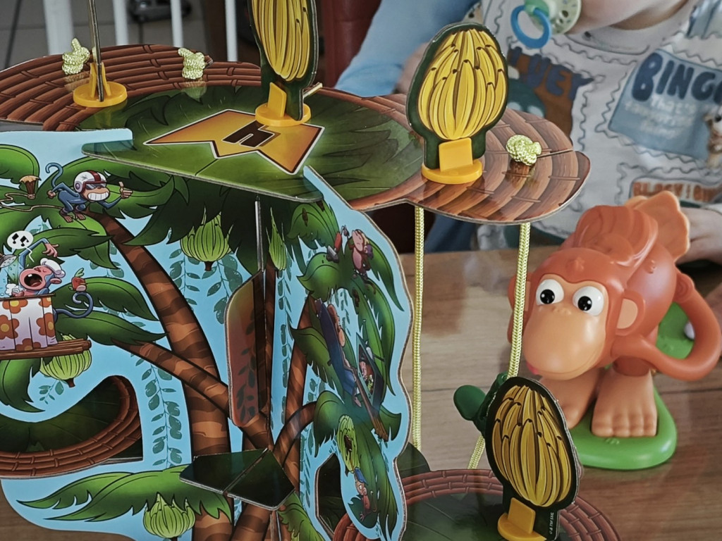 Neben dem Affen muss aber zunächst auch der Baum aufgebaut werden. Dieser ist wirklich hübsch anzusehen und auch so weit stabil. Der Baum hat zwei Ebenen, auf halber und voller Höhe, auf denen Bananenstauden aufgestellt werden, die mit der Kacke heruntergeschossen werden müssen. Dann werden noch vier Seile am Baum befestigt, an denen sich jeweils ein Affe hochhangeln kann. Jeder Mitspieler bekommt einen Affen und schiebt ihn entlang des Seils ganz nach unten.