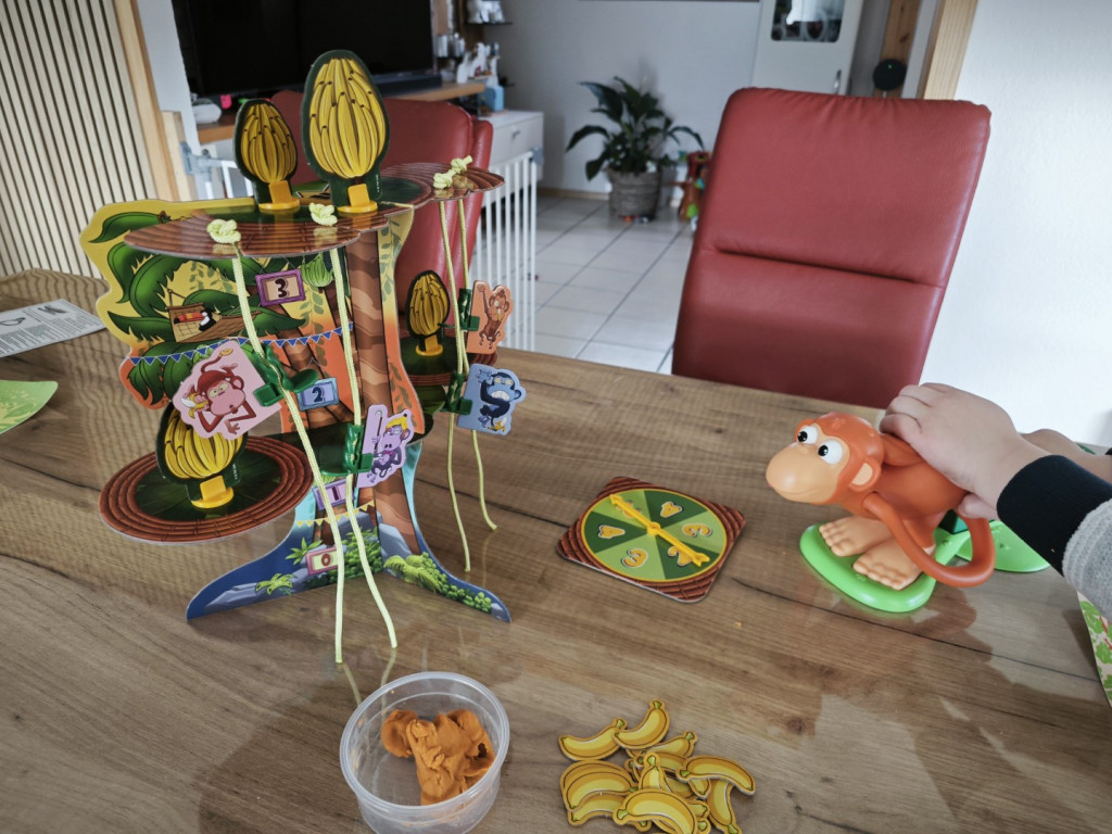 Leider passen weder Baum noch Affe vollständig aufgebaut in die Spieleschachtel, was richtig ärgerlich ist, hauptsächlich für die Erwachsenen, die ständig auf- und abbauen dürfen. Hauptsache die Kinder haben Spaß! Der ständige Auf- und Abbau sorgt aber vermutlich auch dafür, dass die Teile nicht sehr lange halten werden. Wobei der Baum zumindest das Knete schießen gut überstanden hat!