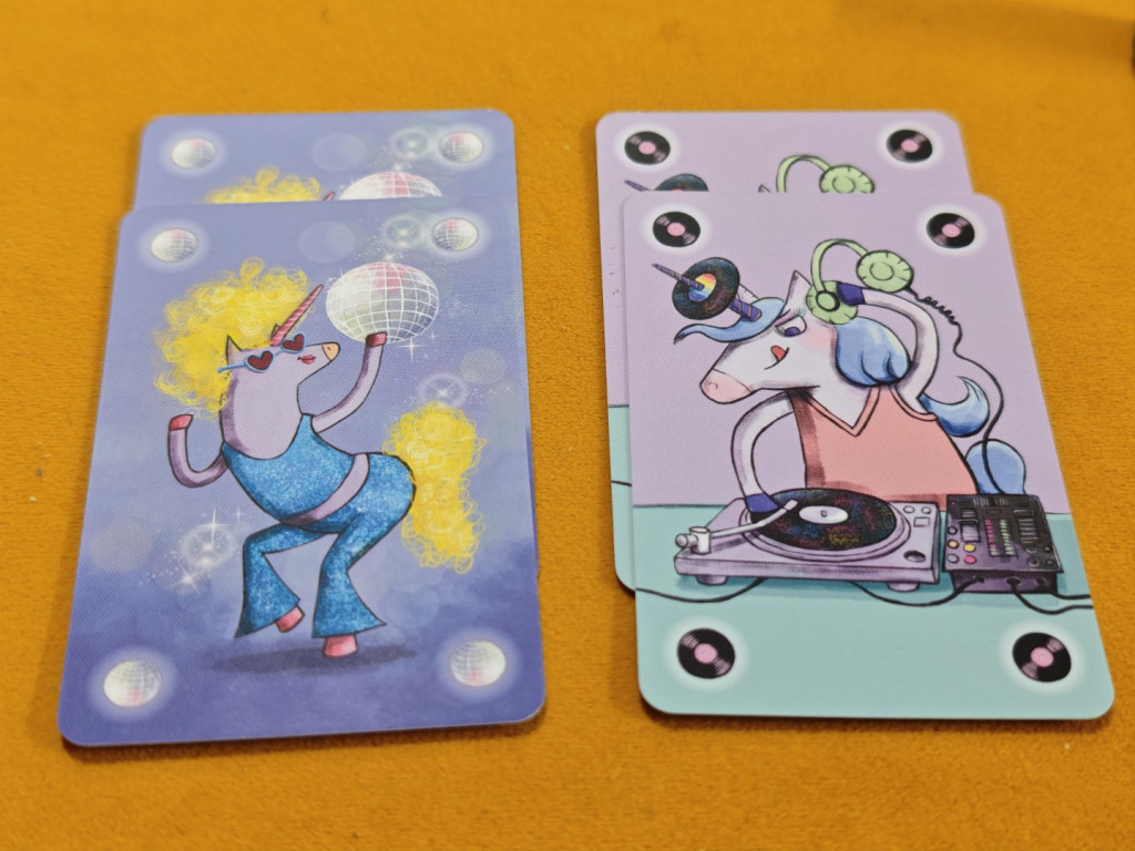 Nachdem man seine sechs Handkarten gesichtet hat, darf man sofort alle Pärchen – also jeweils zwei Karten mit demselben Motiv – in die persönliche Auslage ablegen. Der Startspieler (laut Regel derjenige, der zuletzt Glitzer getragen hat) nimmt sich die lila Einhorn-Holzfigur und beginnt. Danach folgen alle Spieler im Uhrzeigersinn, bis jemand gewonnen hat.