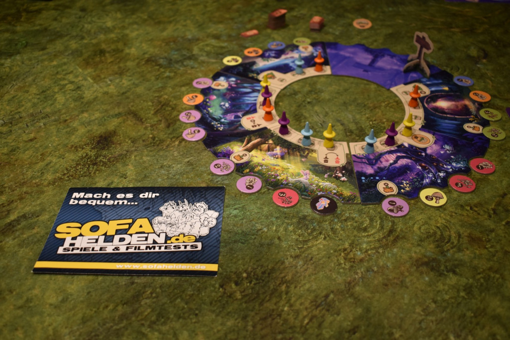 Für den Spielaufbau nehmt Ihr Euch jeweils eine Brautafel. Außerdem wählt Ihr drei Lehrlinge einer Farbe. Die Plättchen mit den Zutaten packt Ihr in den Beutel, nehmt die sechs Waldstücke, mischt sie und legt sie als Kreis aus. Dabei wird ein Waldstück mehr aufgedeckt als Personen mitspielen und die übrigen werden verdeckt gelegt. In die Aussparungen der offenen Waldstücke legt Ihr nun je eine Zutat aus dem Beutel. Dann baut ihr den Wegweiser zusammen und stellt ihn auf das im Uhrzeigersinn erste, aufgedeckte Waldstück. Das Korbplättchen wird neben dem allgemeinen Vorrat an Korken in die Tischmitte gelegt. Nun erhält eine Person den Startmarker und es geht los.