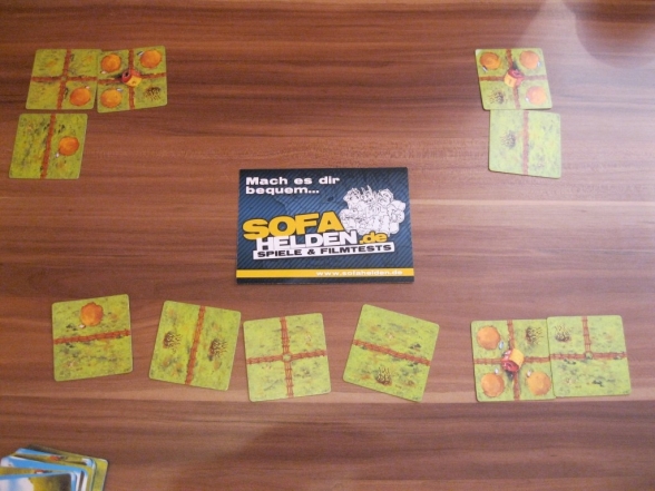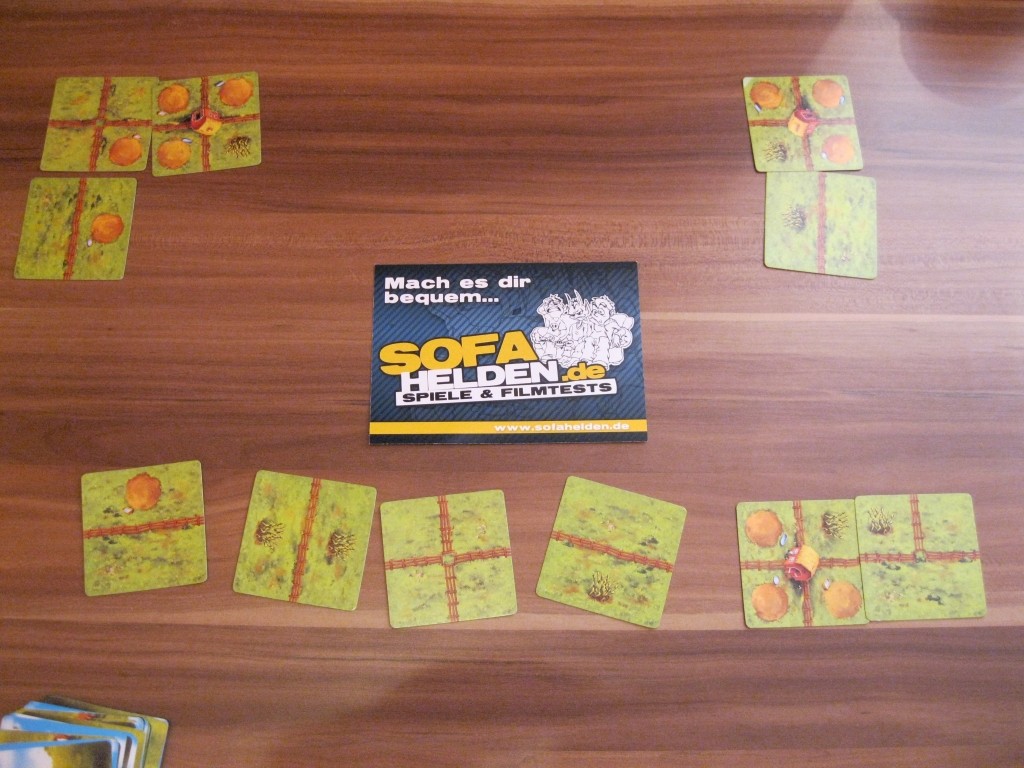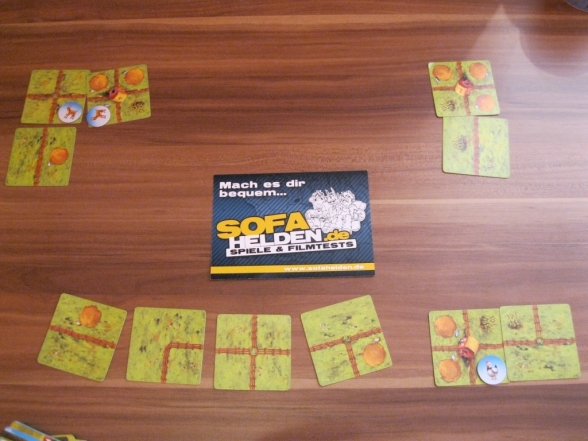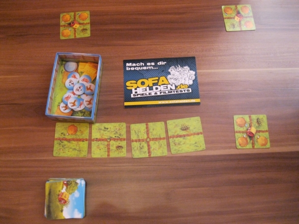 Der eigentliche Spielaufbau ist relativ einfach. Aus den Spielkarten werden die Startkarten und die „Bauernhof“-Karten herausgesucht. Jeder Spieler sucht sich einen Bauernhof aus und legt ihn vor sich hin. Die vier Startkarten werden offen in die Tischmitte gelegt. Bitte beachtet, dass jeder Spieler eine relativ große Farm aufbaut. Schaut also, dass ihr genug Platz auf dem Tisch habt! Alle übriggebliebenen „Bauernhof“-Karten werden gemeinsam mit den anderen Spielkarten gemischt und bilden den Nachzugstapel. Die Tiermarker werden in den Hühnerhof gelegt, damit sie nicht davonlaufen oder von den Wölfen verjagt werden. Beginnen darf der Spieler, der als letzter einen Traktor gesehen hat.