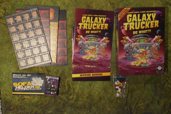 Kommen wir zum Spielaufbau. Generell gibt es erst einmal keine Unterschiede zum Grundspiel. Galaxy Truckers: Do What?! ist modular. Das heißt, Ihr könnt die verschiedenen Komponenten der Erweiterung nach Wahl einsetzen. Dies sind die drei Module: