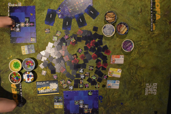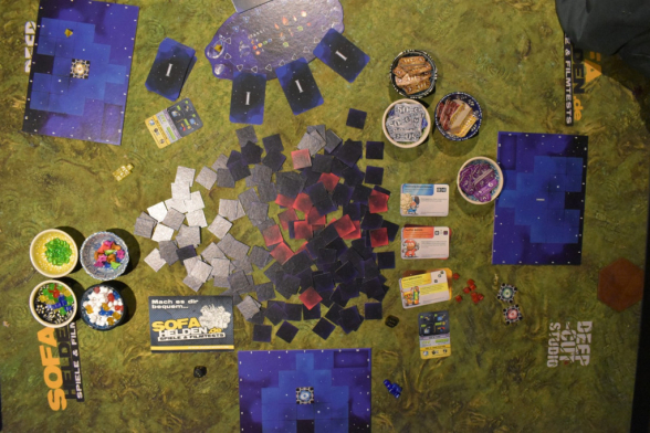 Wir haben uns natürlich dazu entschlossen, alle drei Module zu integrieren. Hierfür mischt Ihr die drei VIP-Stapel nach Ihren Rückseiten und deckt jeweils eine auf. Außerdem mischt Ihr die vier neuen Kabinen mit der speziellen Rückseite und verteilt jeweils eine. Alle legen sie auf das Reservierungsfeld des eigenen Tableaus. Sie ist einfach eine Bonuskabine, die Ihr im Zuge des Raumschiffbaues verwenden könnt. Benutzt Ihr sie nicht, kostet sie Euch - wie aus dem Grundspiel gewohnt - einen Credit. Dann legt Ihr die Übersichtskarten für den rundenweisen Raumschiffbau so aus, dass sie für alle gut sichtbar sind. Außerdem benötigt Ihr einen Würfel und das Missionsheft. Aus letzterem sucht Ihr Euch eine Mission aus und spielt sie in einer Stufe Eurer Wahl. Alternativ könnt Ihr auch die Missionskarten mischen und eine zufällige ziehen. Mit dieser kommt meistens noch zusätzliches Material dazu. Ansonsten baut Ihr alles wie gewohnt auf und lasst die Sanduhren in der Schachtel. Beim rundenweisen Aufbau Eurer Schiffe nehmt Ihr Euch, je nach Startposition, Warenwürfel in Eurer Farbe. Dabei bekommt die Person die als letztes an der Reihe ist acht Würfel. Die übrigen erhalten gegen den Uhrzeigersinn jeweils einen Würfel weniger, sodass die Person, die das Spiel beginnt, am wenigsten Würfel zur Verfügung hat. Dann kann es auch schon losgehen.