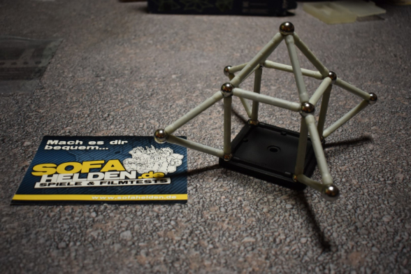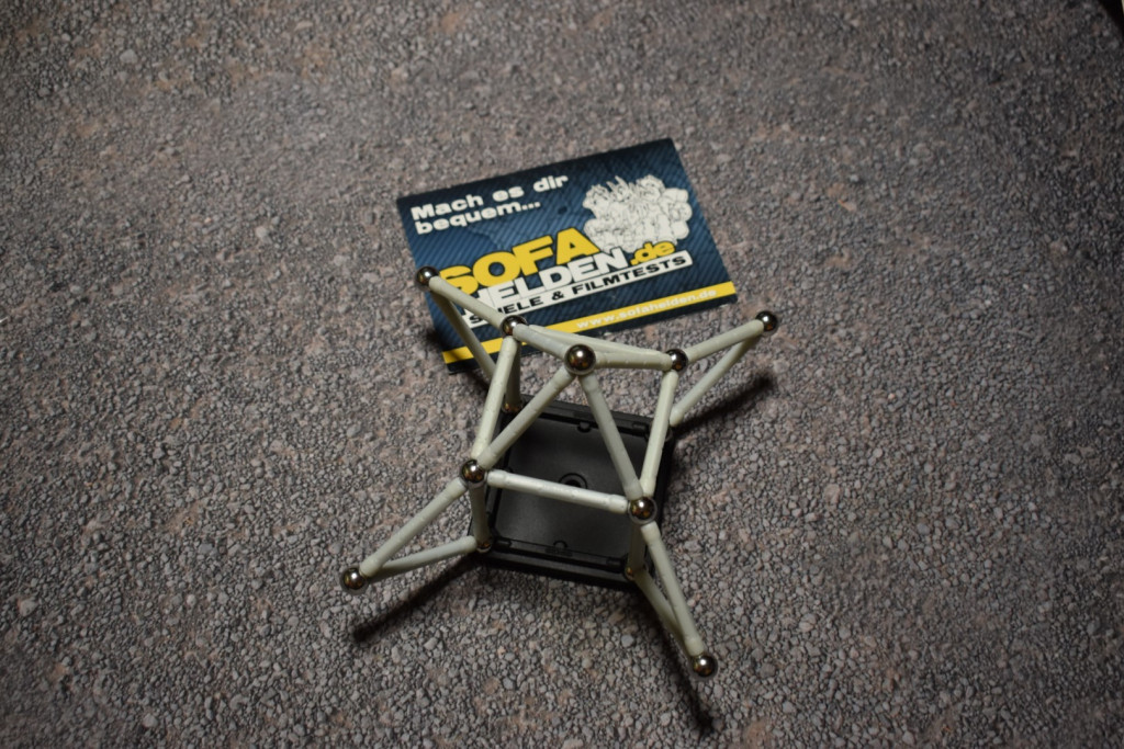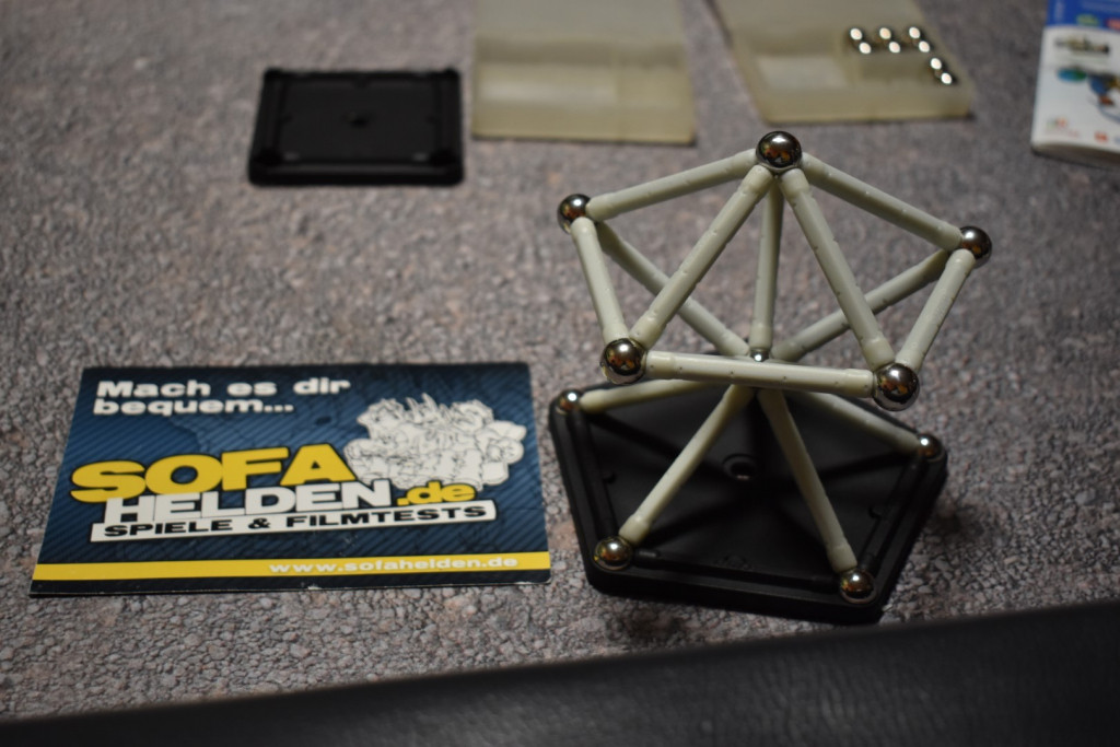 Dass die Magnetstäbe an sich nicht neu sind, sollte bekannt sein. Geomag bringt sie aber nicht nur durch die Verwendung von recycelten Materialien auf ein neues Niveau, sondern auch mit einer höheren Qualität und einer unserer Ansicht nach besseren Haptik erneut in den Fokus. Das Set besteht aus insgesamt 25 Teilen, zu denen vor allem die fluoreszierenden Magnetstäbe mit den Metallkugeln gehören. Darüber hinaus gibt es eine „Arretierung“ in Form einer Grundplatte, die man als Fundament für seine Bauwerke nutzen kann. Für die Stäbe und Kugeln liegt eine Kunststoffbox bei, in der das Material untergebracht werden kann. Die Grundplatte muss irgendwie separat aufbewahrt werden.