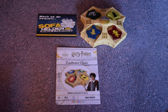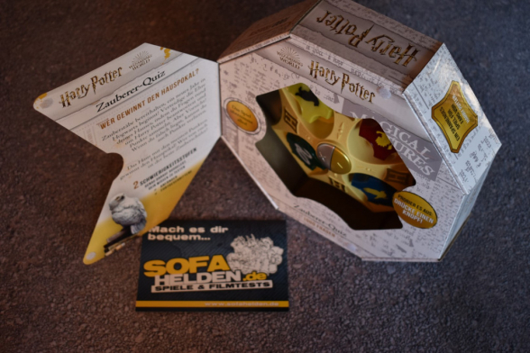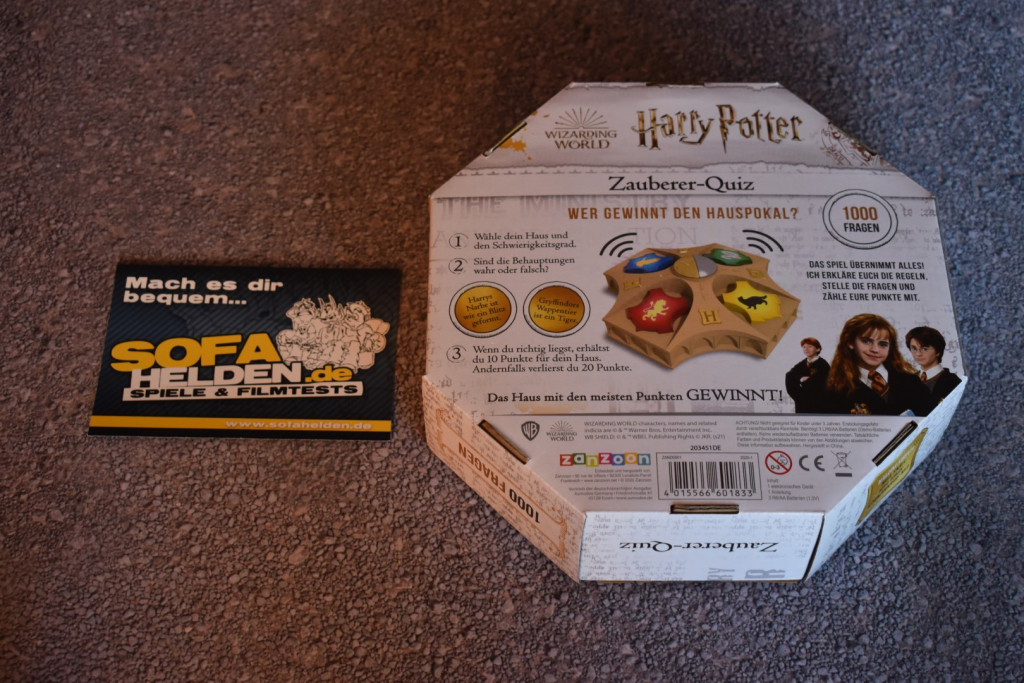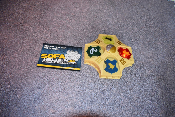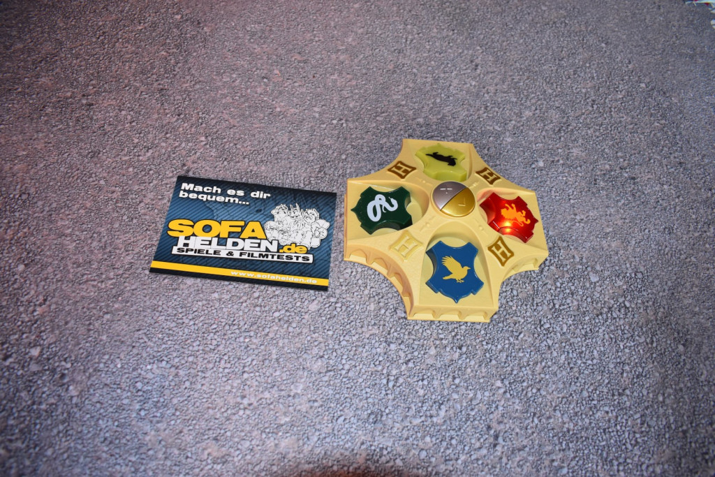 Nunja, das Spielmaterial zum Harry Potter Zauberer-Quiz ist sehr übersichtlich. Man macht den Karton auf und findet eine Anleitung und den, nennen wir es Quizmaster, vor. Insgesamt hat das Gerät zwar ein relativ robustes Gehäuse, die Bedienelemente wirken aber leider nicht sehr langlebig und stabil. Gerade bei einem Quiz, bei dem die Wappen als Buzzer missbraucht werden, sollten diese besonders robust sein. Zum Spielaufbau gibt es nicht viel zu sagen, Spiel in die Mitte stellen, anschalten, fertig.