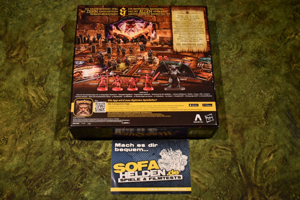 Man muss die Verpackungen nicht direkt nebeneinander stellen, um zu merken: Zwischen der 2021er Version und HeroQuest: Der Aufbruch gibt es gravierende Unterschiede. Im Gegensatz zum älteren Grundspiel passt die Neuauflage nämlich in ein Kallax-Regal. Das ist natürlich nur möglich, indem der Inhalt etwas verkleinert wird. Das wurde mit dem Austausch der Kunststoff-Figuren durch Pappaufsteller ermöglicht. Dadurch sinken nicht nur die Produktionskosten, sondern auch der Kaufpreis auf gut die Hälfte. Ganz auf Kunststoff hat man aber nicht verzichtet. Die Heldenfiguren und der Drache sind weiterhin als Miniaturen enthalten. Diese Edition macht auch keinen billigen Eindruck. Die Marker sind aus eher dünnem Karton, die Monster und Türen wiederum sind sehr dick und wertig produziert. Darüber hinaus ist auch das Design der Monster sehr gut gelungen. Lediglich beim Rauspöppeln müsst Ihr aufpassen, durch die Dicke der Pappe und der Form der Figuren kann sich die Farbschicht des Kartons lösen. Sehr wertig sind auch die Kunststofffüße. Sie sind nicht nur so gestaltet, dass man die Aufsteller ohne Probleme einstecken kann, vermutlich sind sie sogar so robust, dass man beim Drauftreten den LEGO-Effekt erlebt und dabei nicht den Aufsteller, sondern den Fuß zerstören würde. Bei der Gestaltung der Karten und des Spielplans hat man sich am Original orientiert. Während bei neueren Spielen lange Textpassagen zur Beschreibung der Effekte eher eine Seltenheit sind, gehören sie hier zum Standard. Da fühlt man sich wirklich im positiven Sinne etwas in der Zeit zurückversetzt. Die Würfel sind ebenfalls aus Kunststoff. Neben zwei roten Standard W6 findet Ihr sechs „HeroQuest“-Würfel vor, die mit Schilden und Totenköpfen versehen sind. Eben ganz wie im Original. Die Möbel sind hier nur Plättchen. Aber das schafft vielleicht auch etwas mehr Übersicht. Der Spielplan entspricht auf der Vorderseite dem Original, auf der Rückseite gibt es wiederum etwas Neues zu entdecken. Insgesamt kann man also zusammenfassen: Es handelt sich zwar um eine günstigere, aber nicht billige Version des Grundspiels.
