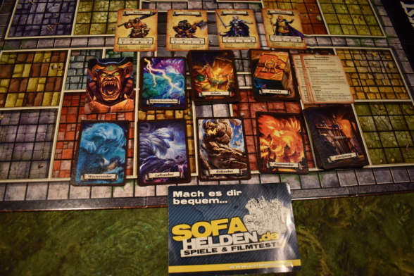 Für den Spielaufbau solltet Ihr die Karten nach ihren Rückseiten sortieren und Stapel bilden. Die Charakterkarten teilt Ihr untereinander auf. Sinnvollerweise spielt Ihr das Spiel mit allen vier Charakteren, unabhängig von der Anzahl der Mitspielenden. Außerdem erhaltet Ihr jeweils eine Übersichtskarte. Nun sucht sich als erstes der Zauberer einen der vier Zauberstapel aus. Anschließend wählt die Elfe einen. Am Ende gehen die übrigen zwei ebenfalls an den Zauberer. Außerdem erhalten alle je einen Charakterbogen, den sie ausfüllen. Die Ausrüstungs- und Artefakt-Karten legt Ihr erst einmal beiseite. Den Stapel der Schatzkarten legt Ihr griffbereit, ebenso den der Monsterkarten. Möchtet Ihr - wie wir - altmodisch mit einem Dungeonmaster (Zargon) spielen, so erhält dieser den Sichtschutz und das „Buch der Herausforderungen“. Dann legt Ihr noch den Spielplan in die Tischmitte und die Marker, Monster- und Türaufsteller bereit. Die Würfel und Heroen-Miniaturen benötigt Ihr ebenfalls. Im Grundspiel sind zehn Szenarien enthalten, die Ihr sinnvollerweise von vorne bis hinten durchspielen solltet, denn sie werden immer schwerer und Ihr erhaltet zwischen den Abenteuern die Möglichkeit Eure Heroen durch Ausrüstungskäufe zu stärken. Zargon baut den Startbereich auf und Ihr stellt Eure Heroen auf das Startfeld. Dann kann es auch schon losgehen. Sinnvollerweise mit der Person links von Zargon.
