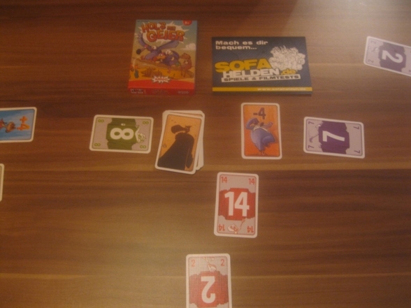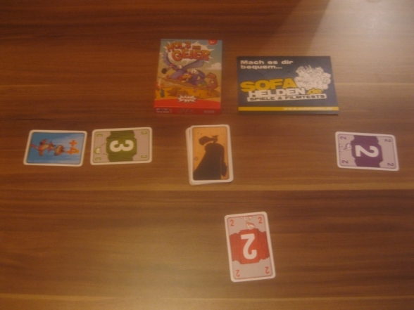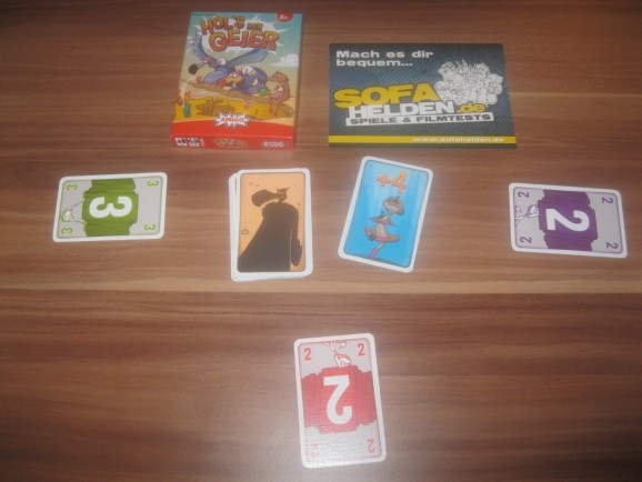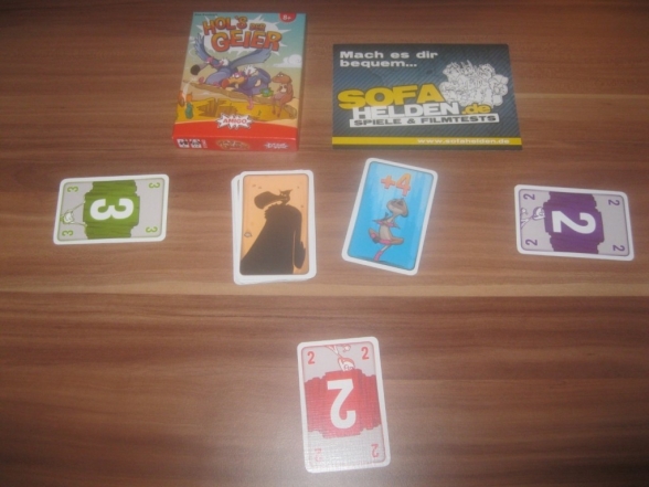 Hol‘s der Geier ist ein Kartenspiel, das in der kompakten Verpackung Kinder ab acht Jahren ansprechen soll. Die Gestaltung mit den auf dem Ast sitzenden Geiern und dem gerade frühstückenden Erdmännchen ist dabei sehr gut gelungen. Auf den Karten setzt sich dieses Schema fort, allerdings primär auf den Punktekarten. Jede von Ihnen ist wie ein kleiner Cartoon. Dagegen wirken die Spielerkarten schon fast langweilig, aber hier steht ja auch die Zahl im Vordergrund, die noch mit Erdmännchen ein wenig verschönert wurde. Für die bis zu fünf Spieler steht jeweils ein Kartenset einer Farbe mit den Zahlen eins bis fünfzehn zur Verfügung. Jeder darf sich eine Farbe aussuchen und sich die Karten nehmen. Die Punktekarten mit dem Geierschatten auf der Rückseite werden gemischt und als Stapel verdeckt in die Mitte gelegt. Einen Startspieler im eigentlichen Sinne gibt es nicht und es kann sofort losgelegt werden.