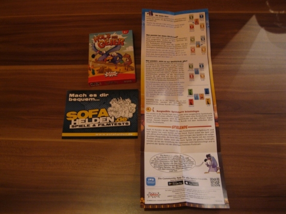Die Anleitung ist schön gestaltet und enthält neben den Beispielen und dazugehörigen Bildern noch einige niedliche Erdmännchen und Geier, die den Regeltext etwas auflockern. Sie umfasst eine Seite, die von beiden Seiten bedruckt ist. Die Regeln sind sehr einfach verständlich und innerhalb weniger Minuten verstanden und auch erklärt.