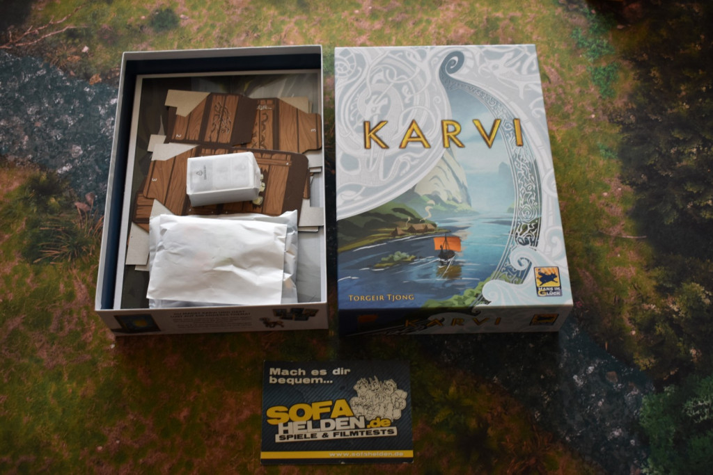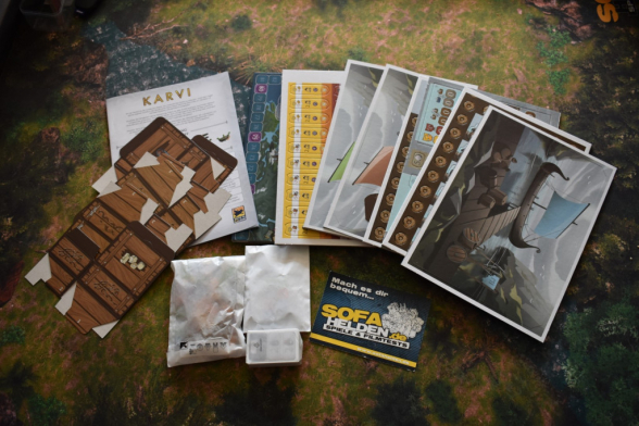 Das Spielmaterial von Karvi ist sehr umfangreich. Schön sind hier aber schon einmal die Verstauungsmöglichkeiten in zusammenfaltbaren Schatztruhen, die uns schon auf der Spielwiesn 2023 ins Auge gestochen sind. Ein weiteres Highlight sind die Schiffe, die erst in Einzelteilen aus den Stanzbögen herausgetrennt und zusammengebaut werden müssen. Sie sind der Namensgeber des Spiels und wirken auch besonders durchdacht, durch den Aufbau sehen sie nicht nur gut aus, sondern sind auch relativ robust. Der Mast dient später zur Aufbewahrung des Brotes (in Bagelform). Darüber hinaus gibt es noch weiteres Spielmaterial, was aus den sieben Stanzbögen herausgetrennt werden muss. Außerdem gibt es noch einiges an Spielmaterial aus Holz - positiver Weise in Papiertütchen und nicht Plastik. Dazu gehören Handelsposten, Türme, Zählmeeple, Würfel und die Ressourcen. Obendrauf kommen noch jede Menge Karten. Ebenfalls positiv sticht das Dorftableau ins Auge. Denn durch einen Puzzlemechanismus beim Spielaufbau kann man hier die Möglichkeiten etwas Variieren. Nachdem die Stanzbögen alle ausgedrückt sind, kann es auch schon an den eigentlichen Spielaufbau gehen.