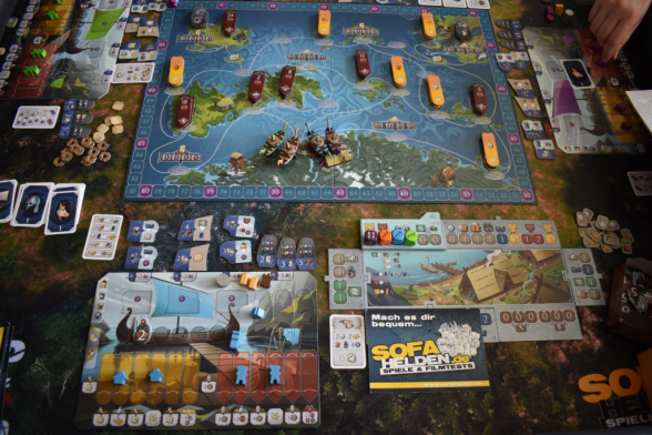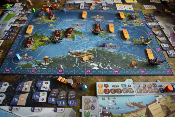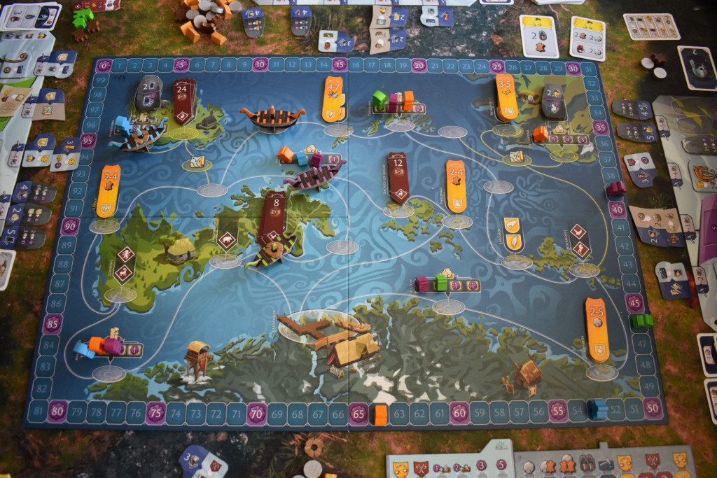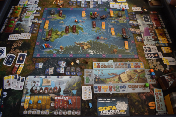 Der Spielplan wird als erstes in die Mitte gelegt. Dabei müsst Ihr je nach Spieleranzahl eine andere Seite nach oben drehen. Dann werden die Orte mit Plünder- und Handelsplättchen versehen. Diese werden nach den Symbolen ihrer Rückseite sortiert und auf die entsprechenden Felder gelegt. Falls Ihr weniger als vier Leute seid, müsst ihr entsprechend weniger Plättchen pro Ort auslegen und die übrigen unbesehen wieder in die Schachtel legen. Das Dorfplateau wird entsprechend Eurer Wünsche und der Spieleranzahl zusammengepuzzelt. Auf die Startfelder werden je nach Spielerzahl Rundenplättchen gelegt. Die besonderen Runensteine werden gemischt und ebenfalls entsprechend der Spielerzahl auf die Felder des Spielplanes verteilt. Die Karten werden nach ihren Rückseiten sortiert gemischt. Von den Handelskarten werden drei aufgedeckt und die übrigen als Nachziehstapel bereitgelegt. Die Ausrüstungskarten werden als Stapel je Kategorie bereitgelegt. Jeder Stapel wird aufsteigend sortiert, sodass zu Beginn die Eins oben liegt. Die übrigen Marker und Ressourcen werden als allgemeiner Vorrat bereitgelegt. Nun müsst Ihr Euch für eine Farbe entscheiden. Euer Schiff stellt Ihr nach Kaupanger, euren Zählmeeple auf die 0 und das Tableau legt Ihr vor Euch hin. Alle erhalten zufällig jeweils zwei Ausrüstungsplättchen für Heck, Segel und Kopf sowie drei Runensteine. Von den Türmen und Handelsposten habt Ihr zu Beginn nur je einen zur Verfügung, die übrigen legt Ihr auf die entsprechenden Felder auf Eurem Tableau. Außerdem nehmt Ihr Euch noch eine Übersichtskarte und eine zufällige Startkarte. Sie bestimmen Euren Start-Vorrat und in welcher Reihenfolge Ihr Eure Würfel auf das Dorftableau legen dürft. Zum Start-Vorrat gehört auch eine gewisse Menge Bier, die Ihr mit Euren Würfeln darstellt. Für die erste Runde beginnt die Person mit der niedrigsten Zahl und darf den Würfel auf das Startfeld auf das erste Feld von Links legen. Dann folgen die anderen mit aufsteigendem Startwert. Nun dürft Ihr noch einen Eurer Runensteine auf Euer Tableau legen. Er ist wichtig für die Endwertung. Aber bevor es soweit ist, starten wir erst einmal das Spiel…