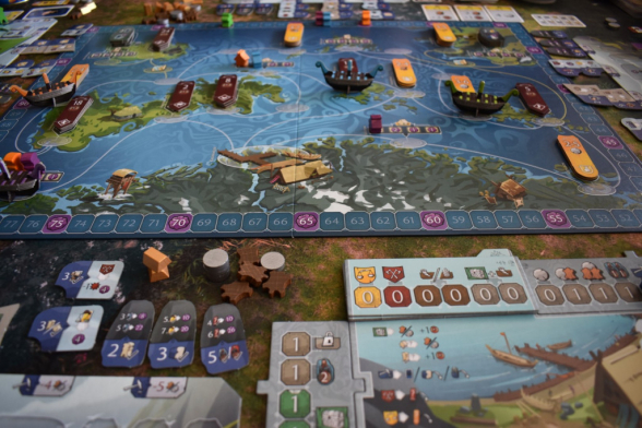 Gerade im weiteren Spielverlauf sind die Felder zum Bier auftanken und Proviant nehmen wichtig, denn durch ersteres erhaltet Ihr Bier, um die Felder auf dem Dorftableau zu bezahlen, und das Proviant wird benötigt, um mit Eurem Schiff zu fahren. Die beiden Felder sind aber so aufgeteilt, dass nicht alle in jeder Runde beide Felder erwischen. Hier gilt die Regel: Wer zuerst kommt, isst/trinkt zuerst. Man sollte also versuchen als eine*r der ersten auf das erste Proviantfeld zu kommen, sodass die anderen sich dann vor einem einsortieren und anschließend noch ein Bierfeld frei ist.