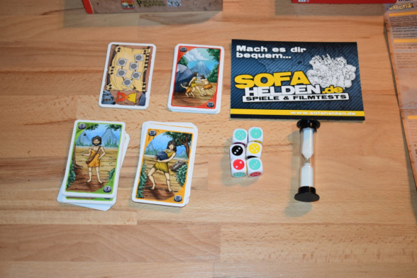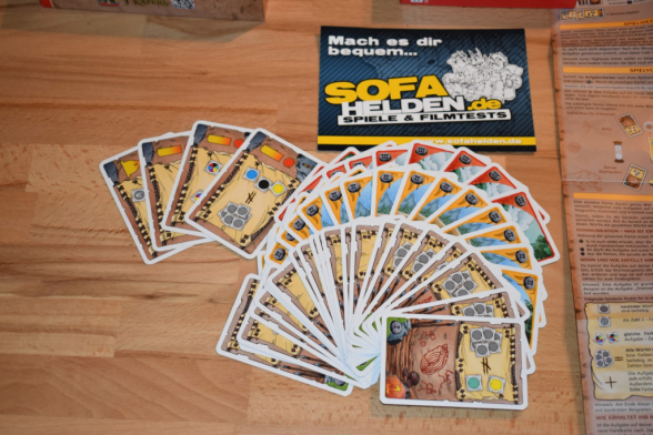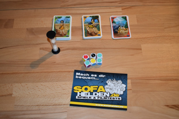 Für das erste Spiel müssen die Karten noch nach ihren Rückseiten und den vier Spezialaufgaben sortiert werden. Letztere werden nur für die Spielvarianten benötigt, nicht für das Grundspiel. Durch die Rückseiten ergeben sich drei Kartenstapel, die jeweils gemischt und verdeckt in die Mitte gelegt werden. Die römischen Zahlen auf der Rückseite geben jeweils die Schwierigkeit von I – leicht bis III – schwer an. Nun nimmt sich jeder Spieler eine Karte von einem Stapel seiner Wahl und nimmt sie auf. Die anderen Spieler dürfen die Karten allerdings nicht sehen. Der oder die Zotteligste darf die Würfel zum ersten Mal würfeln und die Sanduhr umdrehen…