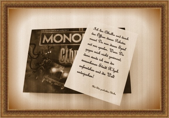 Es stellte sich heraus, dass Cthulhu ein Wesen war, welches vor mehreren hundert Millionen Jahren auf die Erde kam. Auf einem Beipackzettel, welcher ebenso im Paket lag, standen folgende Worte: Ich bin Cthulhu und durch das Öffnen dieses Paketes musst Du nun dieses Spiel mit mir spielen. Wenn Du gegen mich nicht gewinnst, dann werde ich aus der versunkenen Stadt R’lyeh auferstehen und die Welt unterjochen! Unser Chefredakteur konnte es nicht glauben, er wurde auserwählt die Welt zu retten. Dafür musste er aber eine Partie Monopoly gewinnen und erfahrungsgemäß war er in diesem Spiel einfach schlecht und hatte in den vergangenen Spielen mit Freunden immer Pech.