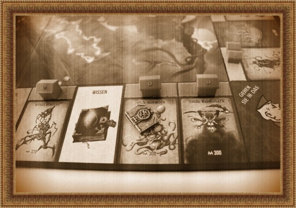 Plötzlich drehte sich der Dolch und zeigte auf die Würfel, welche gerade von Cthulhu geworfen wurden. Die Augenzahl 11 veränderte sich auf 9 und anstatt auf ein eigenes Feld zu kommen, zog die Spielfigur wie von Geisterhand auf ein Feld unseres Helden. Auch wenn er dadurch nicht viel Geld bekam, so war dies nur der Anfang.