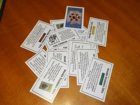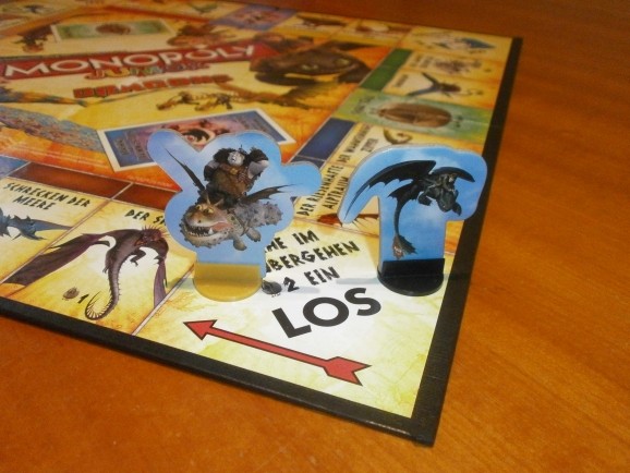 Kommen wir zum wohl größten Punkt, dem Ablauf des Spiels, denn hier hat sich im Vergleich zu den normalen Monopoly-Spielregeln einiges geändert. Den Anfang macht die Auswahl des Spielers, der den ersten Zug machen darf, denn hier wurde ein eigenes kleines Mini-Game ins Spiel integriert. So werden alle Drachenkarten verdeckt an die Mitspieler ausgeteilt, um dann schnellstmöglich auf das jeweils passende Feld gelegt zu werden. Wer als Erster seine Karten richtig und vollständig verteilt hat, beginnt. Gewürfelt wird mit einem Würfel. Der weitere Ablauf ist simpel und schnell umschrieben: Kommt man auf ein freies Drachenfeld, so MUSS dieses gekauft werden und eine der eigenen Trainings-Arenen wird sofort auf den Farbstreifen gestellt. Betritt man ein Feld, das einem anderen Mitspieler gehört, so zahlt man demjenigen den Kaufpreis, der auf dem Feld vermerkt ist. Anstatt Ereignis-, Gemeinschaftsfeldern und Bahnhöfen gibt es bei Monopoly Junior - Dragons lediglich das "Drachen-Trainings-Tipps-Feld" und den "Schafstall". Beim Betreten wird eine entsprechende Karte gezogen und die darauf zu lesende Anweisung ausgeführt. Zu zahlendes Geld landet im Schafstall und der Spieler der das zugehörige Feld betritt, darf den Schafstall leeren. Auch bei den lizensierten Standard-Feldern gibt es Änderungen. Wer über Los kommt erhält zweiSchafe aus der Bank, wer im Gefängnis sitzt der muss nicht drei Runden aussetzen, sondern zahlt in der nächsten Runde ein Schaf und kann das Spiel fortsetzen. Dieses Spielprinzip wird beibehalten, bis nur noch ein Mitspieler Schafe besitzt. Wer keine Schafe mehr hat, verliert und scheidet aus dem Spiel aus.