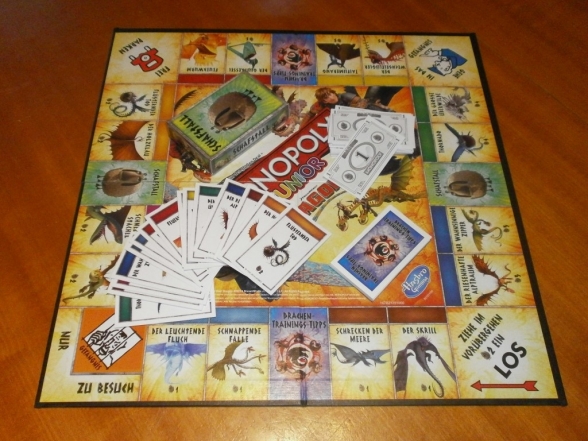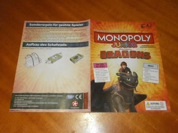 Noch vor dem Öffnen der Verpackung fällt auf, dass der Karton des Monopoly Junior - Dragons ein kleineres, kompakteres und quadratisches Format besitzt, anders als die Standard-Edition des normalen Monopoly. Ist man ins Innere vorgedrungen folgt auf die anfängliche Freude erst einmal Ernüchterung. Der Innenraum des Kartons ist nicht wie gewohnt durch Fächer aufgeteilt und ordentlich angeordnet, sondern hier wurde lediglich durch ein relativ loses Stück Karton eine Freifläche für die Spielfiguren und das Zubehör geschaffen, wo diese Teile lose umherfliegen. Auf dem Karton liegen die Spielanleitung und das Spielbrett, welches zum Spielen wie üblich aufgeklappt werden muss. Hier fallen einem sofort Größe und Aufteilung ins Auge, denn das Monopoly Junior hat je Seite nur 5 Felder plus die lizensierten Eckfelder und ist somit aufgeklappt lediglich 38x38cm groß. Das Spielbrett ist schön designt und sehr stabil und dürfte mit seiner Drachenauswahl anstelle von Straßen gerade auf kleine Drachenreiter-Fans sehr ansprechend wirken. Die Figuren sind hier ebenfalls nicht aus massivem Material sondern müssen aus einer dicken, vorgestanzten Kartonage gedrückt und auf Plastiksockel gesteckt werden. Auch die Häuser im Spiel, hier "Drachen-Trainings-Arenen" sind nur kleine Körbchen aus Plastik in der jeweils zur Spielfigur passenden Farbe. Die Drachenkarten bzw. Drachentrainings-Karten (dazu später mehr) sind aus stabilem, festem Karton, das Spielgeld, hier "Schafnoten", ist dünn, in schlichtem Weiß gehalten, einseitig bedruckt und nicht sehr ansprechend im Design. Als letzten Schritt muss man noch einen "Schafstall" aus festerem Karton zu einer Box zusammenfalten, welche später als Tresor Einsatz finden soll - eine Kartonage als ständig eingesetzte Box innerhalb des Spiels halte ich gerade bei einem Spiel speziell für kleinere Kinder etwas fragwürdig bezüglich Haltbarkeit.