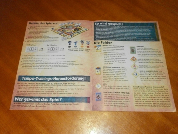 Die Anleitung umfasst neben dem Deckblatt lediglich drei große Seiten. Auf den ersten beiden Seiten werden die Spielregeln erläutert, die zwar ganz anders als beim normalen Monopoly jedoch einfach und schnell zu verstehen sind. Auf der letzten Seite befindet sich die Aufbauanleitung für den Schafstall sowie drei Sonderregeln für geübte Spieler, die sich das Spiel etwas erschweren wollen.