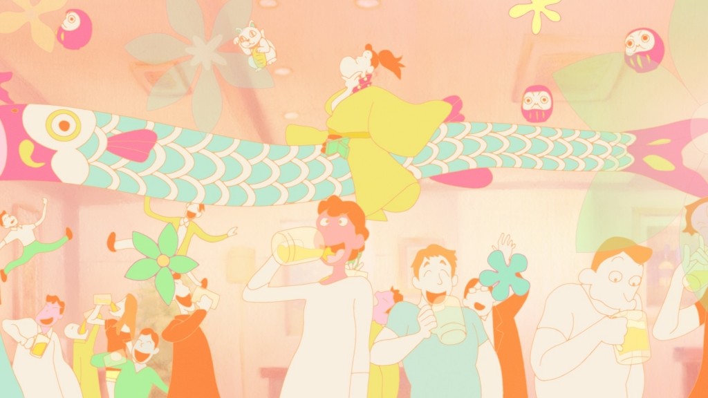 Außergewöhnlichstes Merkmal ist sicher aber die abgedrehte, surreale Richtung, die man mit dem Stil eingeschlagen hat. Der Himmel strahlt dunkelgrün mit sich drehenden Blumen darauf, ebenso abgedreht gestaltet man gerne auch mal den Boden oder Wasser. Die ohnehin schon sehr simpel gezeichneten Charaktere verbiegen sich amüsant und abenteuerlich beim Tanzen und ein kräftiger Schluck aus dem Bier- oder Weinglas zieht sich in wohligen, deutlich sichtbaren Wellen durch den ganzen Körper. In einigen Sequenzen läuft das Mädchen auch durch ein Wirrwarr von Treppen, die sich teilweise über Kopf kreuzen und dabei in Verbindung mit der energischen Musik stark an die surrealen Szenen aus Disney's Fantasia erinnern - alles ein bisschen so wie ein ausgeuferter Drogentrip. Eine gar nicht so falsche Definition, da sich sehr viele Minuten des Films tatsächlich um ausschweifenden Alkoholkonsum drehen.