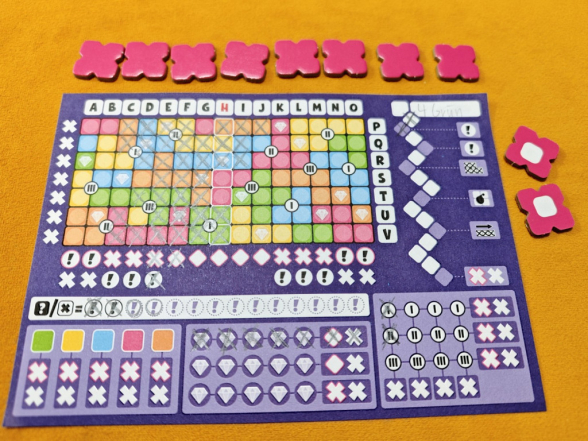 Dieses Wettrennen gibt es auch beim Erreichen von drei anderen Zielen: dem Abschließen von Farben, dem Sammeln von Diamanten und dem Werten von Kreuzungspunkten. So darf der erste Spieler, der alle Felder einer Farbe angekreuzt hat, zwei X-Chips umdrehen, alle weiteren nur einen. Zudem sind im Raster Diamanten verteilt. Immer wenn man ein Feld mit Diamanten ankreuzt, darf man auch das nächste Feld im Diamanten-Bereich auf dem Blatt markieren. Hat man eine Reihe vervollständigt – dafür braucht man jeweils fünf Diamanten – darf man einen X-Chip umdrehen; schafft man es als Erstes, gibt es einen zusätzlichen Bonus wie ein Kreuz auf der Passleiste oder einen zweiten X-Chip.