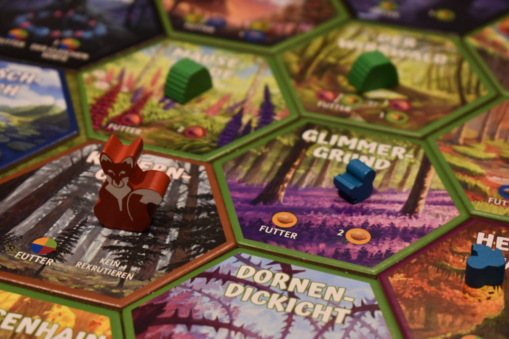 Wie man am Spielverlauf sieht, passiert vieles eher passiv durch die Fuchsbewegung. Hierzu kann auch das Bauen der Kobel gehören. Diese entstehen nämlich, sobald drei Eichhörnchen einer Farbe auf einem Feld stehen. Dabei ersetzt Ihr die drei Eichhörnchen durch einen Kobel-Spielstein. Der Bau eines Kobels führt wiederum zu einer Flucht der andersfarbigen Eichhörnchen. Später dürfen dann aber wieder alle Eichhörnchen auf dieses Feld gestellt und auch weitere Kobel gebaut werden. Doch wofür braucht Ihr die Kobel? Zum einen bringen sie Euch zwei Siegpunkte, zum anderen müssen Sie in einem Revier sein, mit dem Ihr eine Zielkarte erfüllen möchtet. Ein Revier wiederum ist eine zusammenhängende Gruppe aus Waldfeldern, die Ihr mit euren Eichhörnchen oder Kobeln besetzt habt.