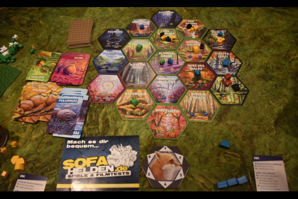 Für den Spielaufbau verteilt Ihr die Waldfelder zufällig in der Tischmitte, sodass Ihr ein sechseckiges Spielfeld erhaltet. Die Nuss-Karten legt Ihr offen und pro Sorte einen Stapel, bereit. Die Zielkarten werden gemischt und je drei verteilt. Von diesen sucht Ihr Euch jeweils zwei aus und legt die dritte wieder ab. Die Übrigen werden als Nachziehstapel in die Tischmitte gelegt. Der Fuchskompass dient im Spielverlauf der Orientierung und sollte für alle sichtbar neben dem Spielfeld positioniert werden. Wichtig ist, dass er ab Spielbeginn nicht mehr gedreht werden darf (auch wenn es im Endeffekt Zufall ist, wo der Fuchs hinläuft). Nun darf die Person, die zuletzt Nüsse gegessen hat, damit beginnen Ihr erstes Eichhörnchen auf einem unbesetzten, grünen Startfeld zu platzieren. Anschließend nimmt sie sich zwei Nüsse in beliebiger Kombination, die links unten abgebildet sind. Darauf folgt die nächste Person im Uhrzeigersinn, bis zur letzten. Diese darf nun, nach demselben Prinzip, zwei Eichhörnchen platzieren. Dann folgt die nächste Person gegen den Uhrzeigersinn, bis Ihr wieder bei der Startspieler*in angekommen seid. Anschließend startet Ihr mit der wilden Nuss-und Eichhörnchenjagd.