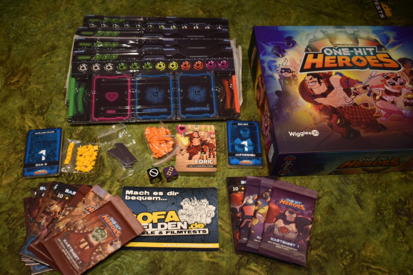 Vielleicht habt Ihr schon unser Unboxing Video zu One-Hit Heroes auf unserem Instagram-Kanal gesehen? Ansonsten erhaltet Ihr jetzt einen kurzen Überblick, was so alles in der Schachtel zu finden ist. Besonders ins Auge stechen einem die Heldentableaus. Sie bestehen aus Karton mit einer Ablagefläche aus Plastik. Irgendwie cool, vom Aspekt der Nachhaltigkeit allerdings doch nicht so richtig. Aber es passt irgendwie zum Spiel, in Richtung Beat ´em up. Ein weiterer Nachteil bei unserem Spiel war, dass sich die Ablagefläche der Energieleiste bei einem unserer Tableaus nach oben verbogen hatte. Hier werden wir nochmal mit einem Föhn oder ähnlichem nachbessern müssen. In Zipp-Beuteln findet Ihr die Schadens- beziehungsweise Aggromarker für leichten und schweren Schaden sowie die Energieanzeiger. Unter den Tableaus befinden sich die Fächer für die Boss-Karten und Tableaus sowie sechs Booster-Packs mit Karten, die Ihr im Zuge des Spiels erhaltet. Die Karten sind allesamt eingeschweißt und lassen sich nur sehr schwer auspacken, da es keine Aufrisshilfe oder ähnliches gibt. Ansonsten macht das Spielmaterial aber einen sehr guten Eindruck und auch das Inlay ist super, da die Karten hier ordentlich sortiert werden können. Auch die Fächer für die Boss-Karten sind sehr durchdacht. Generell ist uns aufgefallen, dass die Schadensmarker unterschiedliche Formen und Größen haben und die Aggro-Symbole nicht nur unterschiedliche Farben, sondern auch im Rahmen unterscheidbar sind. So dürfte das Spiel auch für Farbenblinde gut spielbar sein.