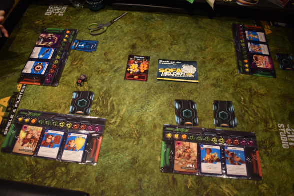 Für den Spielaufbau müsst Ihr Euch erst einmal für eine Episode entscheiden. Das Spiel enthält zwei Episoden mit jeweils vier Bossen. Im Regelfall fangt Ihr mit Episode eins an. Ihr nehmt Euch das Boss-Tableau, lest die Rückseite (das solltet ihr in jedem Fall tun!) und nehmt Euch alles weitere benötigte Material. Hierzu gehört in der Regel das Kartendeck des Bosses (nicht mischen!) und die Schadensmarker, die Ihr auf sein Tableau legt. Anschließend nehmt Ihr Euch jeweils ein Tableau und einen Charakter mit dazugehörigem Deck. Die Charakterkarte legt Ihr auf Euer Held-Feld und zwei eurer Ausrüstungskarten auf die entsprechend markierten Bereiche Eures Tableaus. Auf eure Aggroleiste legt Ihr drei Schadensmarker, sodass die drei weißen Felder verdeckt sind. Dies ist Eure Aggro am Anfang eines Bosskampfes. Anschließend legt Ihr noch den Energieanzeiger so auf Eure Energieleiste, dass Ihr alle drei Energiesymbole seht. Die beiden Würfel legt Ihr in die Tischmitte und bestimmt eine Person, die anfängt. Bevor es nun losgeht mischt Ihr noch Eure Decks und zieht jeweils fünf Karten auf die Hand.