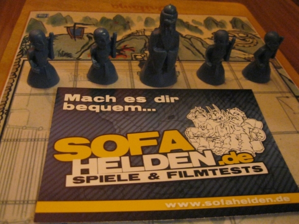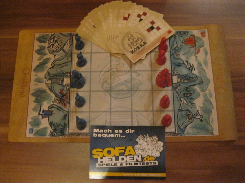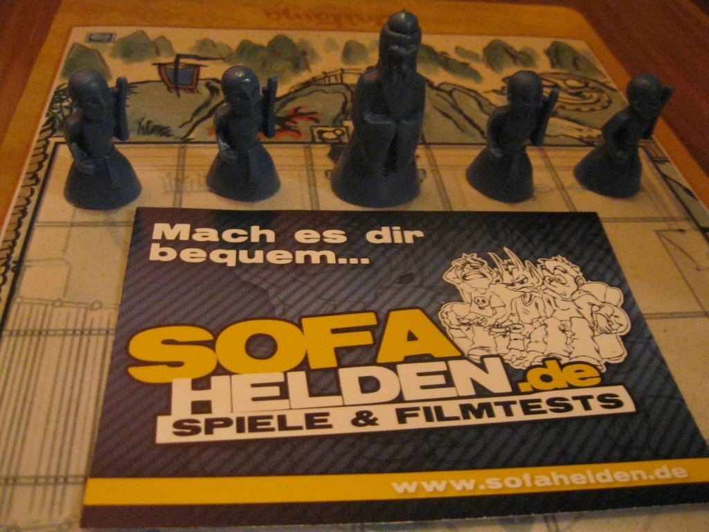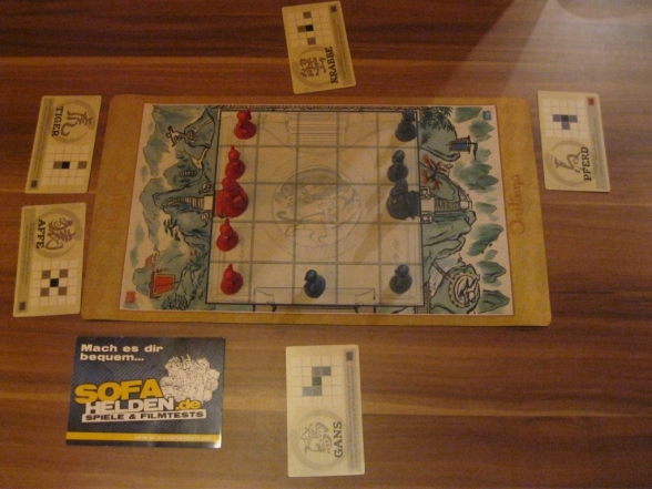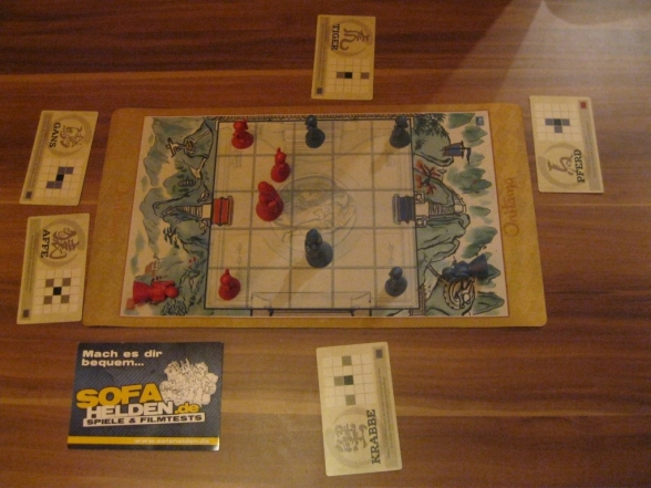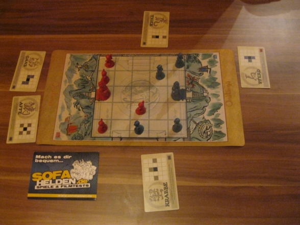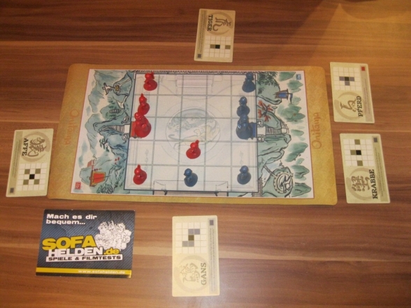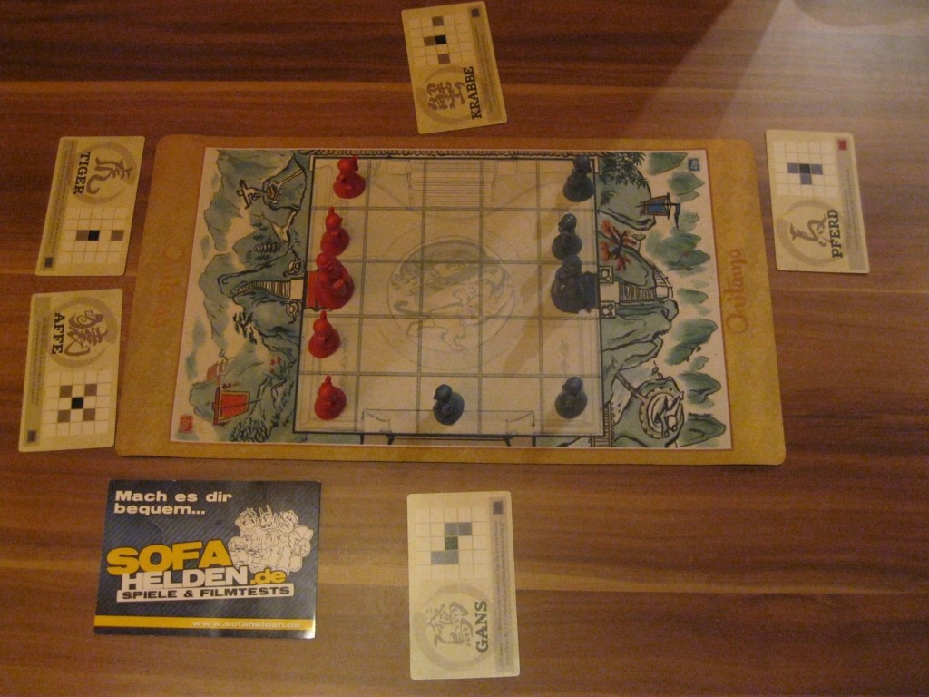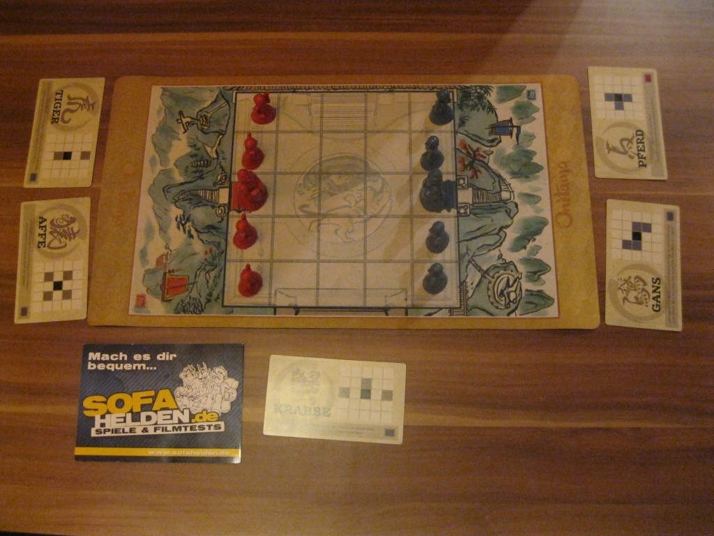 Der Spielaufbau ist denkbar einfach. Jeder Spieler stellt seinen Lehrmeister auf das Tempelfeld der entsprechenden Farbe und die vier Schüler in derselben Reihe auf. Anschließend werden die Bewegungskarten gemischt. Jeder Spieler erhält zwei und eine Karte wird vom Geber aus links neben dem Spielfeld aufgedeckt. Diese Karte zeigt die Farbe des Spielers an, der anfangen darf.