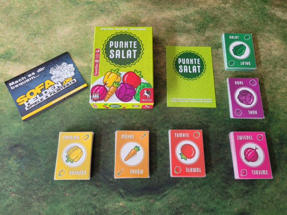 Punktesalat ist ein schnell erlernbares, familienfreundliches Kartenspiel und kommt in einer kleinen transportablen Schachtel. Diese ist dem Spiel entsprechend sehr schön und farbenfroh gestaltet. In der Schachtel findet man nur eine schmale Anleitung und 108 Karten.