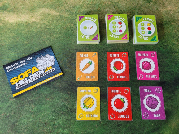 Die Karten sind doppelseitig bedruckt. Auf der einen Seite findet man eine von insgesamt sechs Gemüsesorten und auf der anderen Seite eine Wertung. Eine Wertung könnte zum Beispiel lauten „Habe die meisten Tomaten, um 10 Punkte zu erhalten“, oder „Sammle Paare aus einer Karotte und einer Paprika für 5 Punkte“. Auf jeder Karte findet man eine einzigartige Wertung, wodurch das Spiel sehr abwechslungsreich wird. Man sollte auch darauf achten, welche Wertungskarten man zieht. Auf einigen Wertungskarten, bei denen man für eine bestimmte Gemüsesorte Pluspunkte bekommt, kann man für eine andere Gemüsesorte Minuspunkte erhalten.