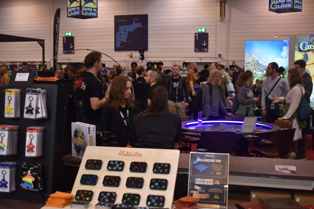 Mittlerweile ist es eine gute Stunde später und wir schlendern in Richtung Halle 3, denn hier steht ein Presseevent an. Wir schnuppern kurz rein, bevor wir in weitere Termine gehen und dabei feststellen: Der Unterschied zwischen Halle 6/7 (Familienspiele) und Halle 3 (Expertenspiele) ist gigantisch. Während man in den ersten Hallen relativ gut laufen kann, muss man in Halle 3 einen auf Lightning McQueen in der Traktorszene machen: Lücke suchen und mit Vollgas drauf zusteuern oder sich in der Masse treiben lassen. Mittlerweile hat sich der erste Eindruck etwas gewandelt: Man realisiert, wie groß die Messe ist und wie viele Leute die angestrebten 220000 Messebesucher*innen in 4 Tagen eigentlich sind. Trotzdem sind wir dazu gekommen noch einige gute Gespräche mit Verlagen zu führen und uns dort Spiele zeigen zu lassen.