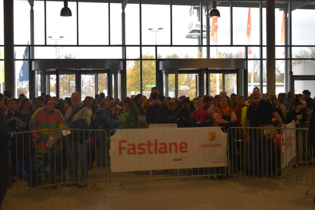 Tag 2 bedeutete nicht nur für uns mehr Personen, mit denen wir spielen „mussten“, sondern auch mehr Besucher für die Spielwiesn. Man merkte schon direkt beim Einlass: heute ist deutlich mehr los. Anders als am ersten Tag entschied sich die Security auch dazu, die Tickets der Besucher*innen schon einzuscannen und alle vor den Hallen zu sammeln, bevor die Türen zu ebendiesen geöffnet werden. Nachdem die Messe offiziell eröffnet war, mischten auch wir uns unters Volk und schlossen als erstes unsere Bildungslücke bezüglich des originalen 7 Wonders. Anschließend versuchten wir uns an Van Helsing und tauchten ab mit The Crew: Mission Tiefsee. Dann standen wir etwas auf dem Schlauch, was wir spielen sollten. Also drehten wir eine Runde durch die Halle 5, um vielleicht einen Verlagstisch zu ergattern, aber: keine Chance. Somit blieb noch eine Hoffnung: ein größeres Spiel auf der Exklusiv-Fläche zu spielen. Und siehe da: hier konnten wir noch einen letzten Tisch ergattern und das Spiel Thebai anspielen. Letztes Jahr gab es diese Fläche auch schon, doch wir hatten sie noch nicht genutzt. Dieses Jahr war sie größer und wir hatten das Gefühl, dass man hier gut Chancen hat, einen Platz zu ergattern und zu spielen. In unseren Augen eine sehr gute Lösung für die teureren Spiele. Hier waren auch einige Erklärer*innen unterwegs, sodass sich die meist komplexeren Spiele nicht erst durch die Regelstudie in die Länge zogen. Auch dieses Jahr wurden etwa gegen Mittag weitere Spielflächen eröffnet. Dieses Mal wurde Halle 4 hinzugefügt und mit Tischen und Bänken ausgestattet.