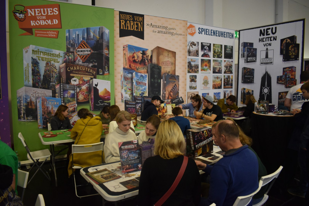 Was uns im Vorfeld aber schon aufgefallen ist: man konnte den einen oder anderen neuen Verlag entdecken. Hierzu gehörte zum Beispiel auch der Rollen- und Brettspielverlag Squink, den wir schon auf der SPIEL 2025 unter die Lupe genommen hatten. Kurz vorher hatten wir gerade erst NussFieber getestet und wollten uns nach den neusten Infos zu Fateforge und dem Crowdfounding-Projekt Draconis erkundigen. Letzteres läuft übrigens nicht mehr lange und wir haben selbst investiert. Denn es wurde uns leider zu gut als „anfängertaugliches Rollenspiel für die ganze Familie“ gepitcht. Anschließend ließen wir uns auf der großen Spielfläche nieder, um ein paar Spiele zu spielen. Hierzu gehörten das etwas ältere Karak von Kosmos, Kavango von Schmidt Spiele und das lange unterschätzte Neuland von Game Factory. Doch wie so oft, verging die Zeit wieder viel zu schnell und es war plötzlich 18:00. Noch eine Stunde bis zu unserem Event…
