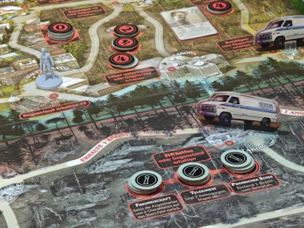 Zuletzt wählen die Spieler jeweils einen Charakter. Man hat die Wahl zwischen den Kids Lucas Sinclair, Mike Wheeler, Dustin Henderson und Nancy Wheeler sowie den Erwachsenen der Serie Jim Hopper und Joyce Byers mit jeweils einzigartigen Sonderfähigkeiten. Hat man sich entschieden, nimmt man sich die Miniatur und das Tableau des entsprechenden Charakters. Auf das Tableau wird ein Angstmarker auf das Startfeld der Angstleiste platziert. Das sind quasi die „Lebenspunkte“, denn erreicht der Angstmarker das letzte Feld, ist ein Charakter hinüber. Die Miniatur wird auf den Spielplan gestellt: Jeder Charakter startet auf einem anderen Ort des Spielplans, wie auf dem Charaktertableau angegeben. Zuletzt wird die Elfi-Miniatur auf das erste Feld der Ereignisleiste des Spielplans platziert. Sie hat nur drei Felder.