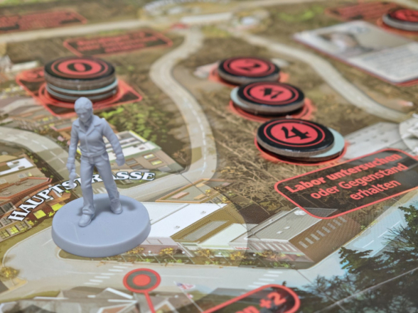 Es gibt zwei wichtige Regeln zur Bewegung: Zum einen blockieren Gegner die Bewegung. Sobald man einen Ort mit einem Gegner betritt, endet die Bewegung sofort; nur wenn man seine Bewegung an einem Ort mit Gegner beginnt, darf man den Ort verlassen. Dann wären da noch Straßen, die mit „erhalte 1 Angst“ markiert sind. Diese befinden sich meist in der Schattenwelt. Hier will man sich also nicht lange aufhalten.