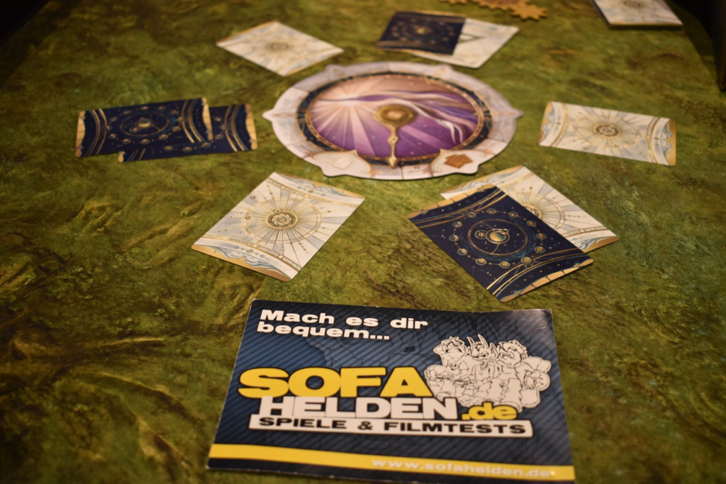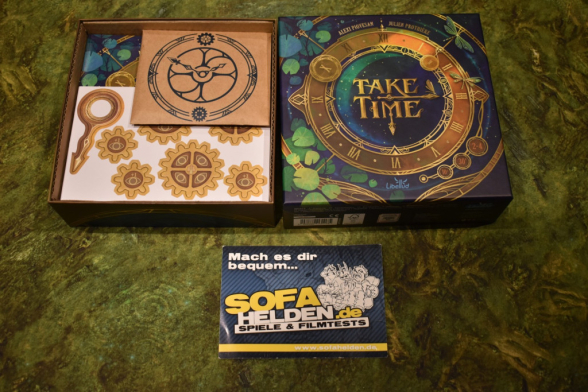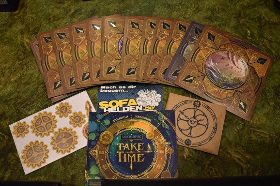 Das Spielmaterial zu Take Time ist relativ übersichtlich: Zwölf mysteriöse Umschläge mit schönem Uhr-Artwork, ein Stanzbogen und ein Papierumschlag mit Karten. Zu Beginn kann man zum Spielmaterial noch nicht so viel sagen. Die Marker des Stanzbogens sind eher schlicht, die Artworks der Uhrenumschläge wunderschön. Die Karten - eine Augenweide. Leider erkennt man es auf den Fotos nicht so richtig, sie sind alle auf den Rückseiten mit einem 3D-Effekt versehen. Ihr könnt die aufgedruckten Mondphasen und die Sonne also nicht nur durch die reflektierende Goldfarbe sehen, sondern auch ertasten. Dagegen wirken die Uhren schon fast trist. Sie sind vom Material her eher dünn, aber das ist ok. Dafür sind sie aber optisch sehr ansprechend.