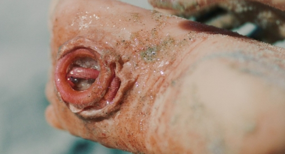 Ein wenig erinnert The Beach House an den etwa ein Jahr zuvor veröffentlichten Science-Fiction Horrorstreifen Die Farbe aus dem All - Color Out of Space. Während der mit Nicolas Cage perfekt besetzte Trip jedoch tatsächlich auf einer Kurzgeschichte H. P. Lovecrafts basierte, muss sich The Beach House damit begnügen, einige Parallelen aufzuweisen beziehungsweise eine ähnliche Richtung einzuschlagen. Auch hier dauert es eine ganze Weile, bis tatsächlich etwas geschieht. Eine Weile, in der das drohende Unheil dank atmosphärischer Inszenierung stets spürbar ist, in der die Zeit aber nur spärlich dafür genutzt wird, den Charakteren genug Platz zur Entwicklung einzuräumen. Hintergrundgeschichten und Charakterzüge werden höchstens angedeutet, so dass letztendlich nur klar wird, dass die wenigen Beteiligten Figuren nur oberflächlich miteinander auskommen, unter der Oberfläche aber starke Differenzen brodeln. Das ist zwar eine recht dünne Grundlage, reicht aber dann doch aus, um das Folgende einordnen zu können. Im Mittelpunkt steht nämlich stets die stark aufspielende Liana Liberato, die als einzige etwas mehr über sich offenbaren darf und den Film in der zweiten Hälfte schließlich auch komplett auf ihren Schultern tragen muss. Dann aber schlägt The Beach House nach der rein auf bedrohlicher Atmosphäre aufbauenden ersten Filmhälfte endlich zu und versorgt den Zuschauer mit allerlei Bodyhorror und Ekeleffekten, die ebenso ansprechend wie widerwärtig in Szene gesetzt wurden. Was dabei allerdings in Vergessenheit gerät, ist die bis dato ohnehin schon recht schwammige Geschichte, die in der zweiten Hälfte beinahe komplett aus den Augen verloren wird. Immer wieder bekommt der Zuschauer kleine Informationen spendiert, die jedoch noch lange kein stimmiges Gesamtbild erschaffen, und letztendlich bleiben unzählige Fragen offen, für die es keinerlei Antworten gibt. Natürlich kann hier durchaus einiges zwischen den Zeilen hineininterpretiert werden, wie beispielsweise eine ökologische Botschaft samt erhobenem Zeigefinger, doch um etwas interpretieren zu können, muss das Ganze zunächst dennoch erst einmal unterhalten - und das gelingt The Beach House nicht durchwegs, denn dafür ist das Geschehen einfach zu schräg, surreal und effektiv auch zäh.