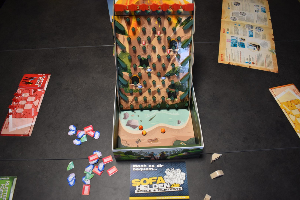 Bereits auf der Spielwarenmesse 2025 in Nürnberg sprach uns das Spiel mit seinem auffälligen Aufbau an. Der Vulkan wird aus zwei Kunststoffelementen zusammengesteckt. Beide sind mit Kartoneinlagen versehen, die den Berg grafisch dazu machen. Am Gipfel befinden sich sechs Einwürfe für die Lavakugeln. Außerdem ist der komplette Berg mit „Nubsis“ versehen, die zur Lenkung der Kugeln und als Abstellfläche für die Figuren dienen. Damit der Vulkan auch ordentlich steht, gibt es noch drei weitere Kartonelemente, mit deren Hilfe man das Ganze in der Schachtel aufbauen kann. Somit können dann auch die Lavakugeln nicht wegrollen. Hinzu kommen vier Spielerbögen, zwei eingeschweißte Kartenstapel sowie drei Zippbeutel mit Felsvorsprüngen, Figuren und den Lavakugeln. Zum Auspöppeln gibt es auch etwas, nämlich die Edelsteine, die Ihr im Spielverlauf sammeln sollt. Insgesamt macht das Spielmaterial einen sehr guten Eindruck und ist relativ robust. Dennoch sollte man gerade beim Aufbau mit den Kartonelementen aufpassen, da sich die einzelnen Schichten beim Stecken lösen können. Die Karten sind leider in Folie eingefasst und lassen sich sehr schwer auspacken. Entweder braucht man gute Fingernägel oder ein Messer.