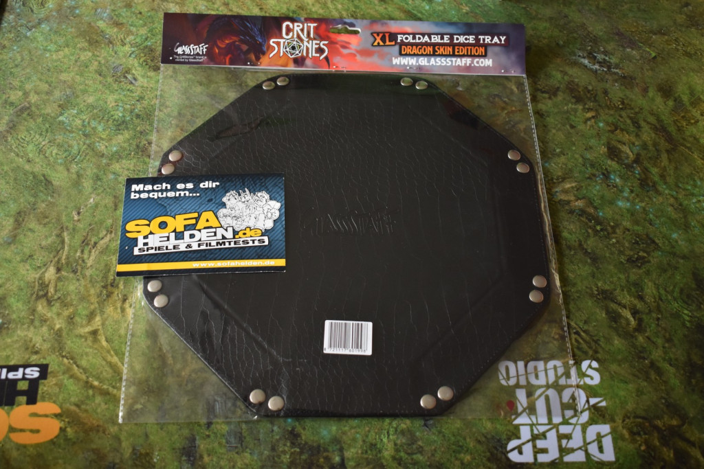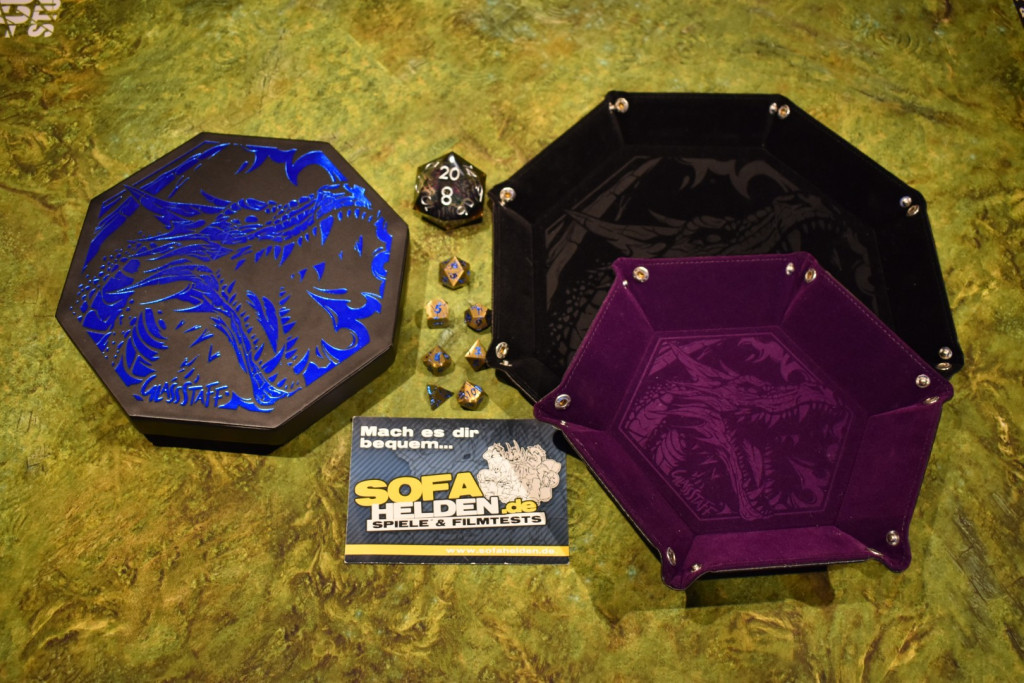 Auf dem Teststand stehen: Ein XL Foldable Dice Tray, eine Dice Arena, ein Sundered Spells Metal RPG Dice Set und ein Spectrum Sentinel 50mm Liquid Core D20. Gut, klingt erstmal alles nach Fachchinesisch. Fangen wir mit dem Dice Tray und der Dice Arena an. Ersteres wird im flachen Zustand ausgeliefert und lässt sich mit den Druckknöpfen zu einem Würfelbehälter zusammendrücken. Außen mit Kunstleder versehen, innen mit Samt, wirkt es sehr wertig und stabil. Der Zusammenbau gestaltet sich gerade am Anfang etwas fummelig. Dank der Druckknöpfe lässt es sich aber auch gut wieder auseinandernehmen, sodass man es im flachen zustand verstauen oder mitnehmen kann. Anders ist es bei den Dice Arenas. Sie sind starr und bestehen aus sehr robustem Karton, der teilweise ebenfalls mit Kunstleder überzogen ist. Innen befindet sich ebenfalls Samt. Die Besonderheit hier ist, dass man den samtverkleideten Deckel als Würfelarena benutzen kann, aber auch den unteren Teil. Dieser ist sogar in zwei Bereiche geteilt. Den äußeren, in dem die Würfel im „Ruhezustand“ aufbewahrt werden können, und den inneren, in dem man würfeln kann. Praktisch ist hier, dass man seine Lieblingswürfel und gegebenenfalls weitere Accessoires gut und geschützt transportieren kann.