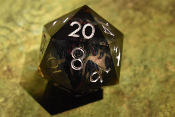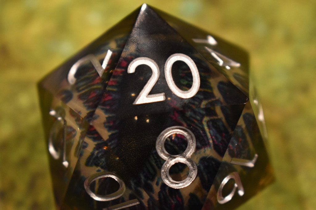 Apropos Schutz: diesen benötigt man für seinen Tisch, sollte man die Metallwürfel auf der nackten Tischplatte nutzen wollen. Sie sind sehr solide und schwer, lassen sich aber sehr gut würfeln. Sie sind definitiv nicht für Gamegenics Crystal Twister - Dice Tower geeignet, dieser würde vermutlich gnadenlos zersplittern. Ein besonderes Highlight aller Würfelsets von Glassstaff ist die Verpackung, die man zu einer Art Würfelturm umbauen kann. Man nimmt das Inlay mit den Würfeln heraus und steckt den äußeren Schuber in die Aussparungen des Inneren. Außerdem schiebt man im Inneren des Schubers die Seitenteile etwas hoch, sodass sie Dreiecke bilden und die Würfel beim Durchwerfen würfeln. Hierbei helfen Magnete im Inneren der Verpackung. Selbst diese wirkt sehr wertig und die Idee mit dem Würfelturm ist sehr gut. „Etwas zu groß“ für alle Würfeltürme, die uns bekannt sind, ist der Spectrum Sentinel 50mm Liquid Core D20. Es fängt hier mit der Verpackung an. Er kommt in einer Metalldose, die gut gepolstert ist, sodass ihm beim Transport nichts passieren kann. Der riesige W20 liegt gut in der Hand, braucht aber auch einen großen Tisch, sonst stellt man den rollenden Felsen aus Indiana Jones auf dem Spielplan nach. Besonders interessant ist bei diesem Würfel das flüssige Innere, in dem sich ein gruseliges Auge befindet. Wir haben bewusst nicht getestet, ob dieses Auge vielleicht Schummelnde verflucht.