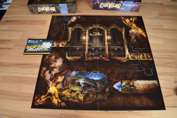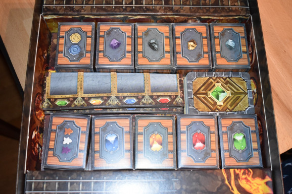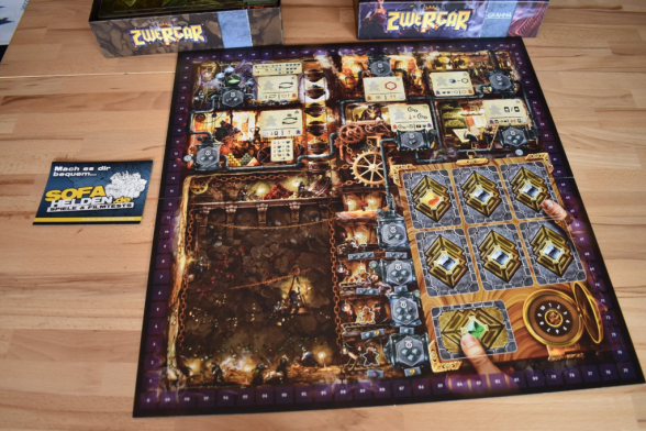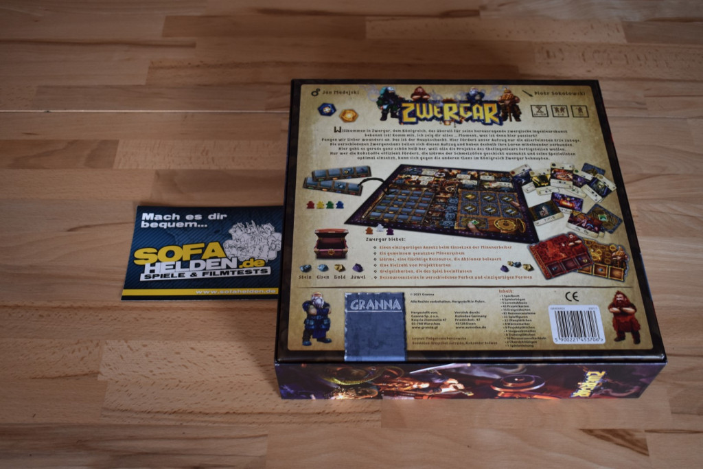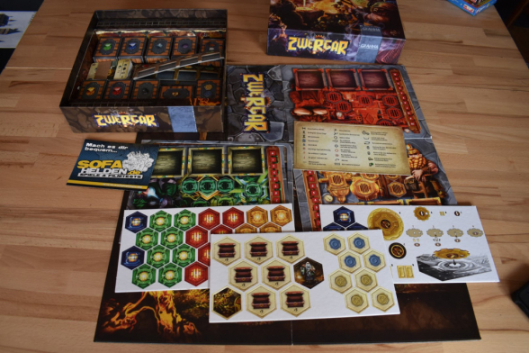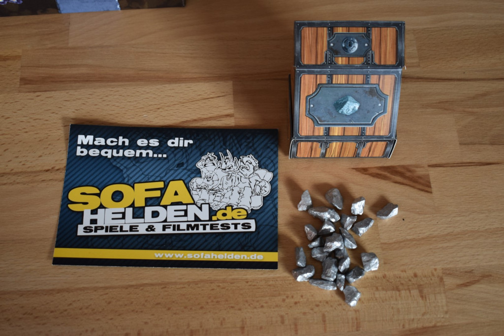 Fangen wir mit einem besonderen Highlight an: Die Verpackung von Zwergar wirbt damit, dass das Spielmaterial plastikfrei ist. Das ist nicht nur ein leeres Versprechen, sondern eine Tatsache, denn im Inneren des Kartons befinden sich neben einiger Stanzbögen ausschließlich Spielmaterialien aus Karton, Holz und … Stein. Das klingt jetzt auf den ersten Blick etwas komisch, aber es handelt sich hierbei um die Ressourcen Kristall, Gold, Eisen und Stein, die entsprechend ihres Materials unterschiedlich bemalt sind. Das hat für die Zukunft natürlich den Vorteil, dass man dieses Material selbst neu basteln könnte. Ein weiteres Highlight ist die Aufbewahrung. In der Schachtel befinden sich zehn Schatztruhen aus Karton, die liebevoll zusammengefaltet sind und vorerst nur die Spielfiguren enthalten. Später, nachdem man die Marker aus den Stanzbögen geholt hat, werden diese auch in den Truhen verstaut. Außerdem gibt es eine Truhe für jeden Zwerg mit einem in seiner Farbe aufgedruckten Kristall, in die er oder sie sein gesamtes Spielmaterial - außer dem Spielerbogen - packen kann.