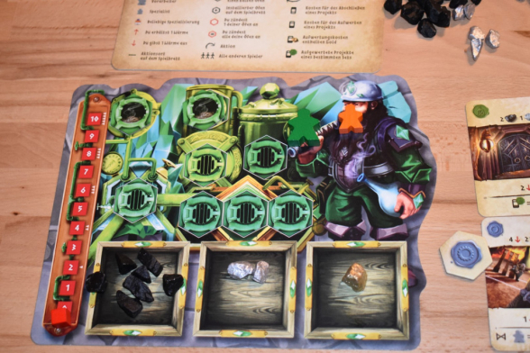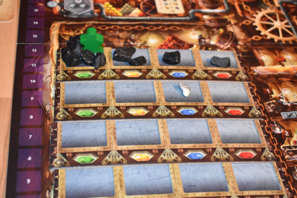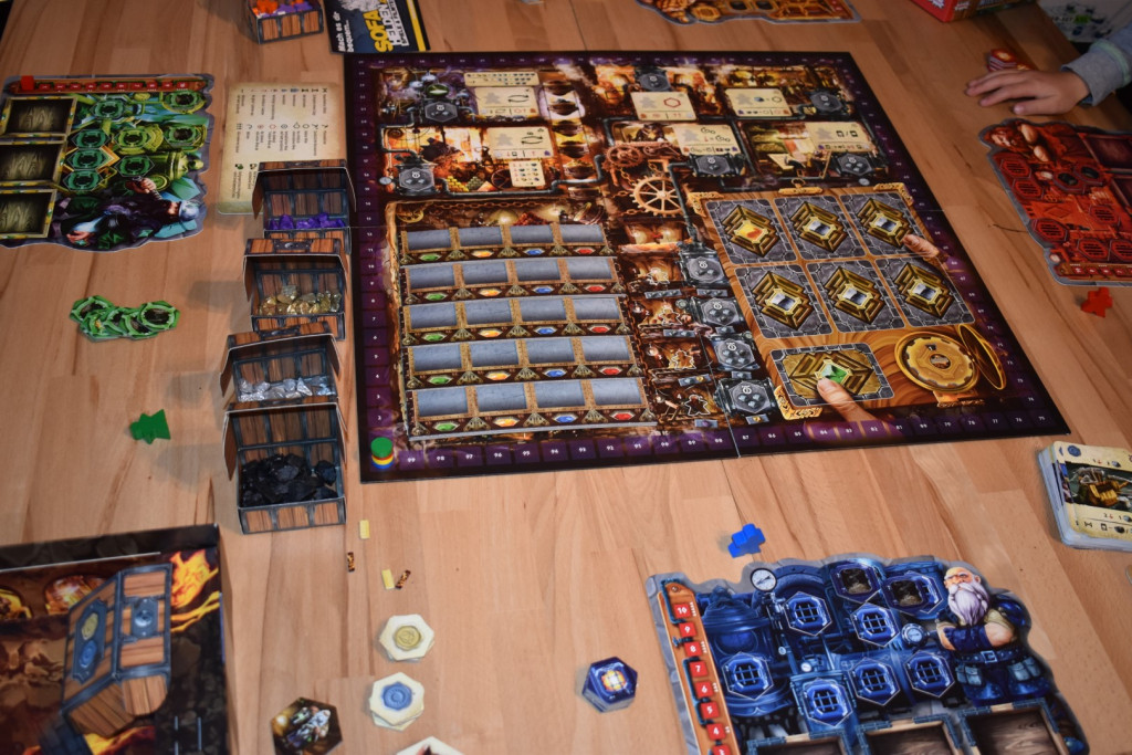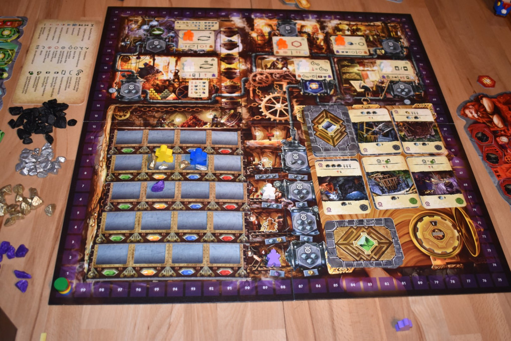 Beginnend mit dem Startspieler haben die Spieler reihum drei Aktionen. Diese bestehen im Wesentlichen daraus, eine Spielfigur auf dem Spielplan zu platzieren. Dabei stehen verschiedene Orte zur Auswahl wie zum Beispiel die Mine, in der man die Rohstoffe in seinen Loren sammeln kann. Außerdem gibt es dann den Aufzug, in dem man die Loren nach oben befördern kann, um die Rohstoffe zu sammeln. Hat man irgendwann genug Rohstoffe, kann man diese im Büro des Ingenieurs für die Erfüllung von Aufträgen nutzen oder beim Alchemisten oder der Schmelze umformen. Hierbei ist Wärme häufig ein wichtiges Element. Diese erhält man zum Beispiel durch seine Öfen, die man beim Dampfkessel entzünden kann. Ein weiteres wichtiges Element des Spiels ist der Vorarbeiter, der bestimmte Aktionen wie zum Beispiel das Bauen von eigenen Öfen auf dem Spielplan erlaubt, aber auch die Farbe der Experten, die man setzt. Diese führen nämlich zu optionalen Sonderaktionen, die einen im Spiel voranbringen. So erhält man zum Beispiel im Aufzug zusätzliche Erfahrung. Damit ist die Fülle an Aktionen in den ersten Runden erst einmal sehr überwältigend, klärt sich dann aber Schritt für Schritt auf und im Endeffekt geht es primär darum, so viele Aufträge wie möglich zu erfüllen und dabei möglichst noch auf die Farben zu achten. Sobald alle an der Reihe waren, wird eine Ereigniskarte aufgedeckt. Diese beeinflusst dann zumeist den Spielverlauf der kommenden Runde. Sobald die letzte Karte aufgedeckt wird, wird diese Runde noch zu Ende gespielt, das Spiel beendet und die Siegpunkte ausgewertet.